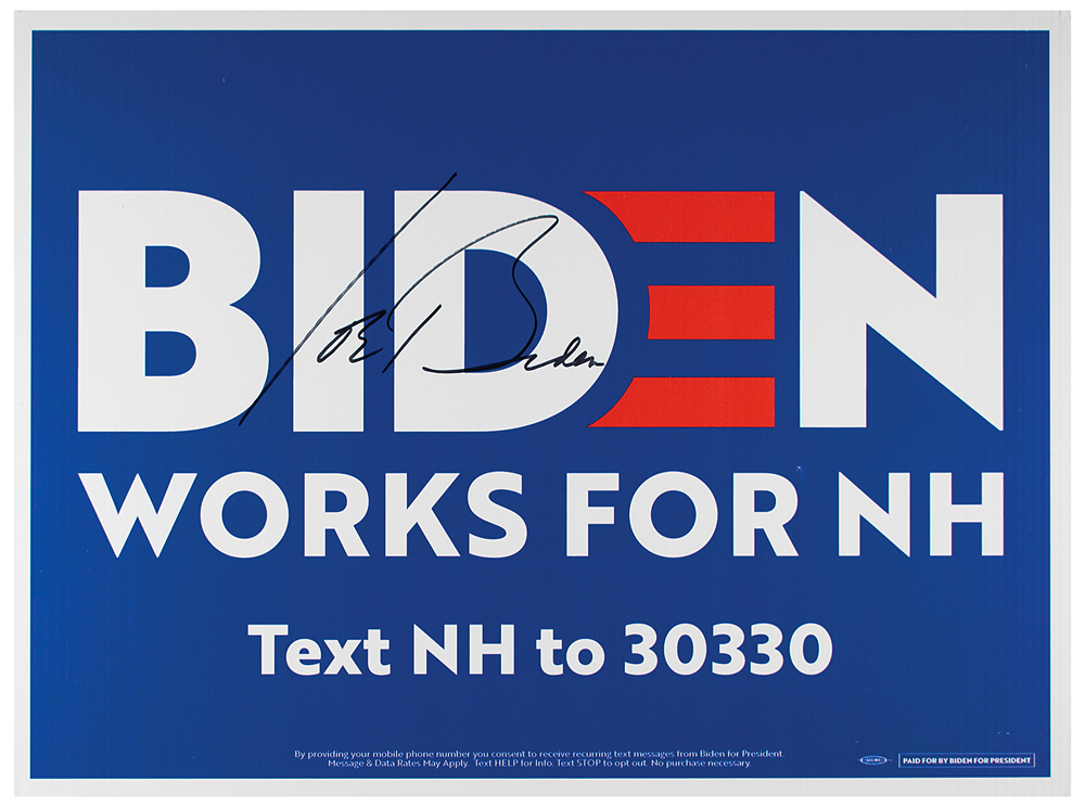 Desirable campaign sign from the 2020 Democratic presidential primary in New Hampshire, 23.5 x 17.5, prominently signed in black felt tip by Joe Biden. The sign boasts the slogan, "Biden Works for NH." In fine condition.