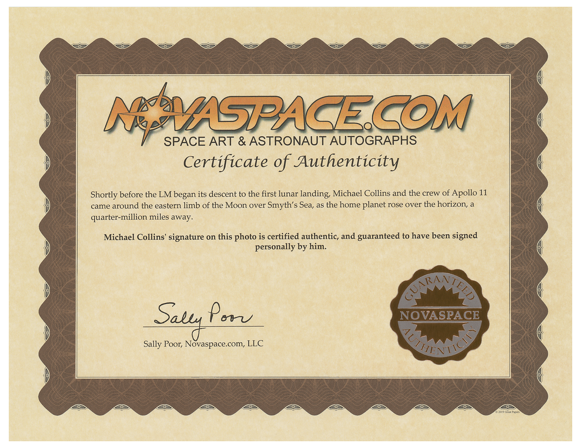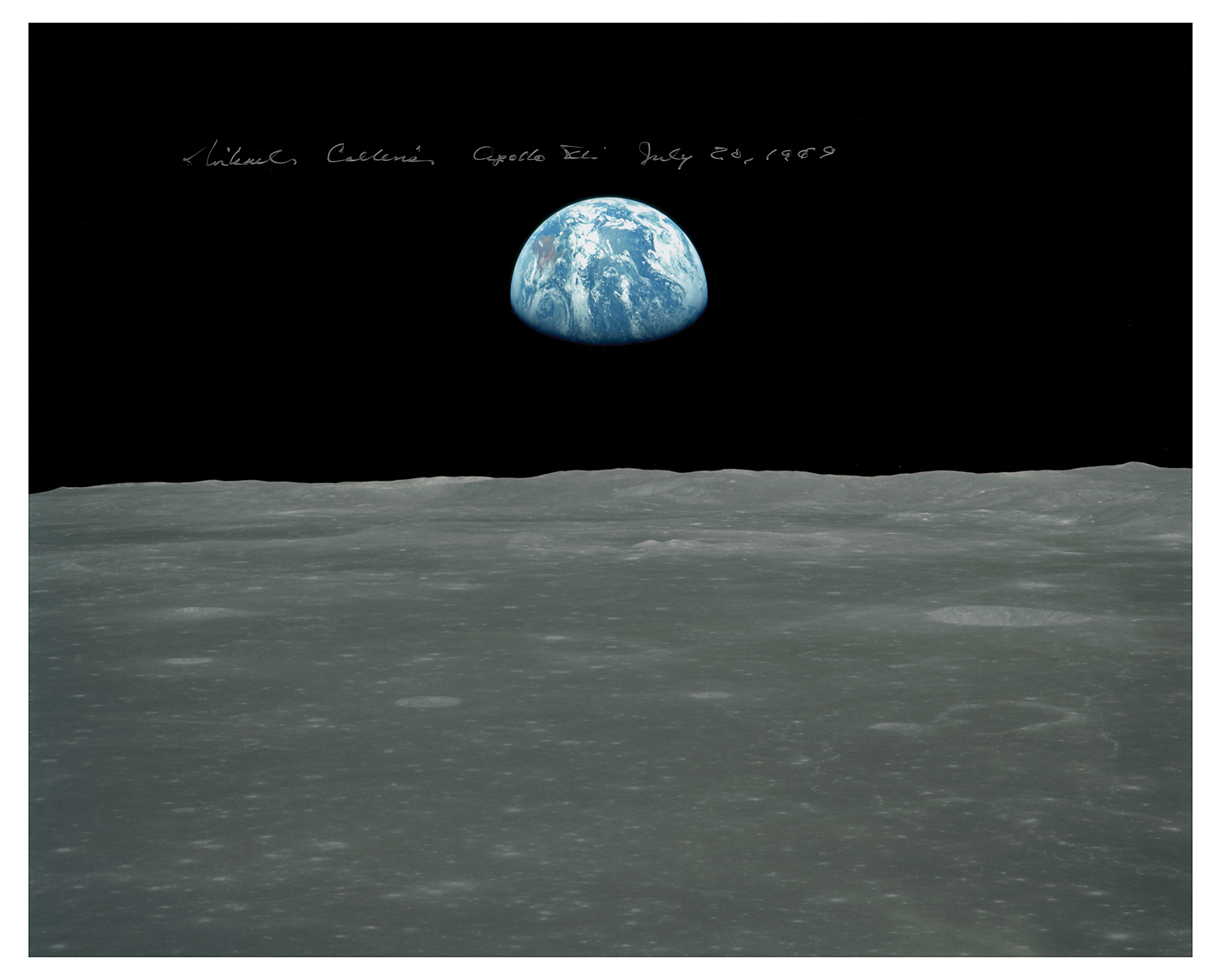 Color satin-finish 20 x 16 photo of Earth as seen over the lunar surface during the Apollo 11 mission, signed in silver ink, "Michael Collins, Apollo XI, July 20, 1969." In fine condition. Accompanied by a certificate of authenticity from Novaspace.