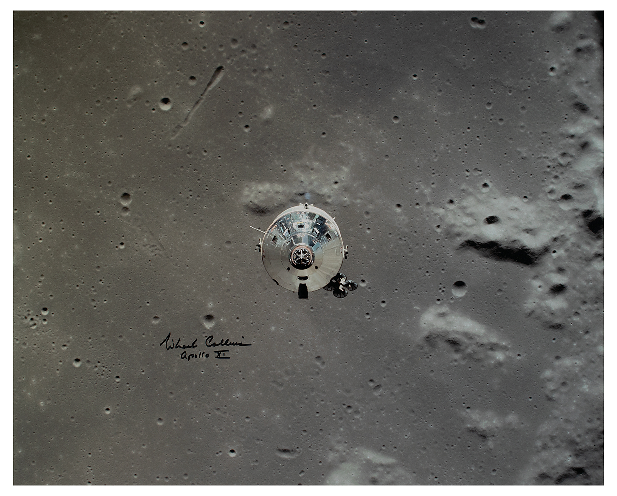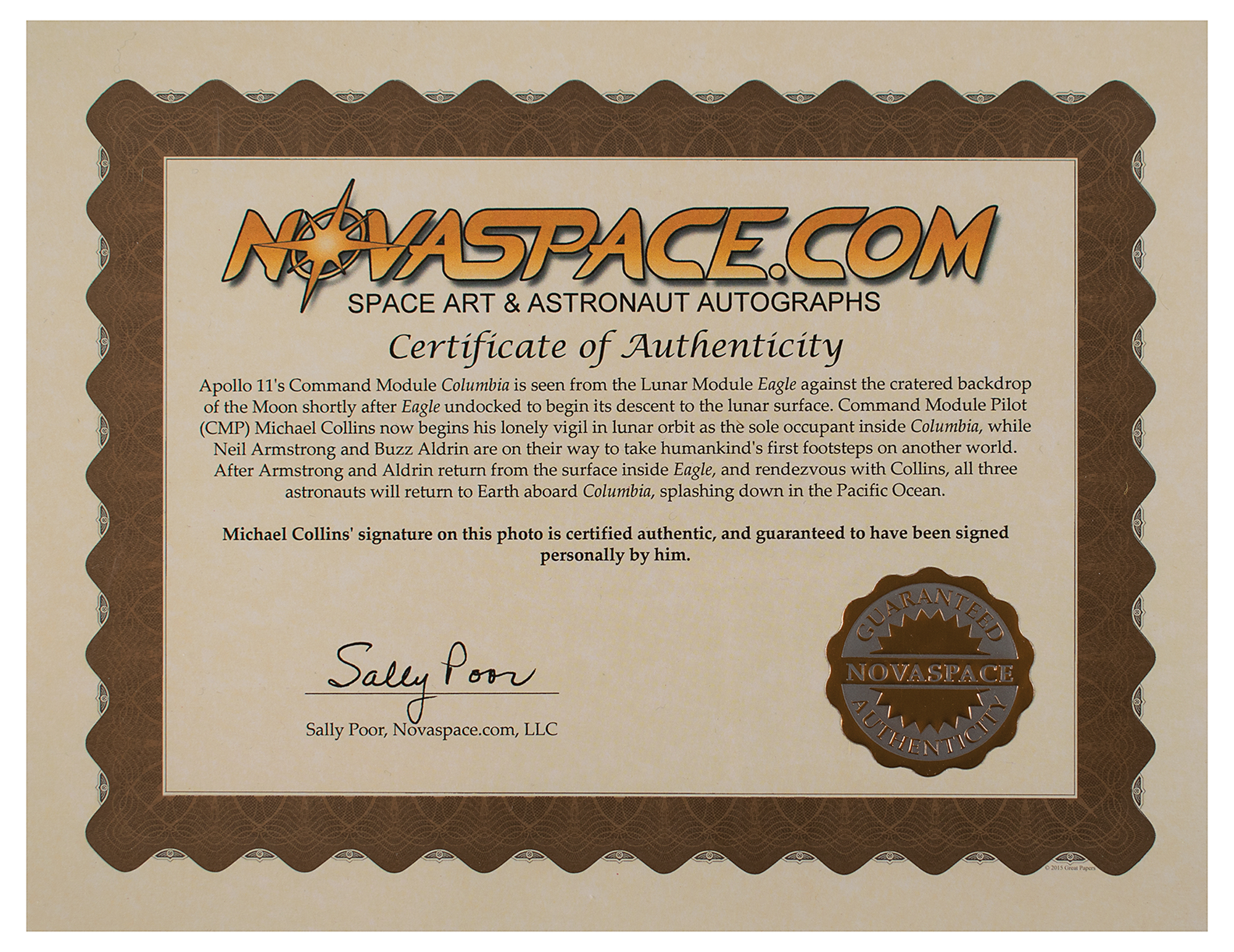 Color satin-finish 20 x 16 photo of the Command Module Columbia soaring high above the lunar surface during the Apollo 11 mission, signed in black felt tip, "Michael Collins, Apollo XI." In very fine condition. Accompanied by a certificate of authenticity from Novaspace.