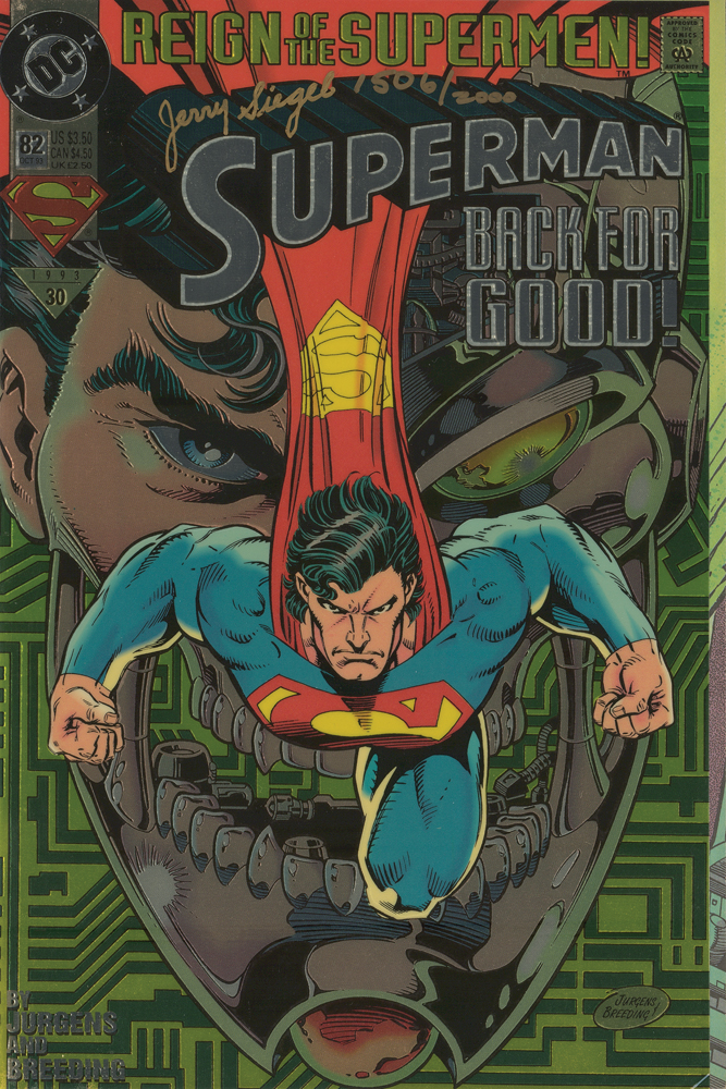 Limited edition of Superman #82 from October 1993 with a special foil cover, numbered 1506/2000, 6.75 x 10, 30 pages, signed on the front cover in gold ink by Superman co-creator Jerry Siegel. In very fine condition. Accompanied by a certificate of authenticity from Dynamic Forces, Inc.