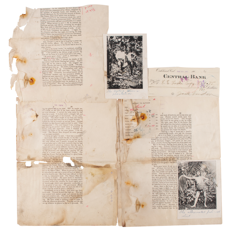 Two items, comprising five pages of London's galley proof manuscript for The Cruise of the Snark, along with a signed check from the author. The printed manuscript galley proof pages, 9 x 11.75, stamped "1st Rev.," include two illustrations. The check, filled out and signed by London, "Jack London," is payable to the C. E. Locke Mfg. Co. for $0.75, May 20, 1905. In overall very good condition, with dampstaining and splits to the proof pages. Chronicling London’s 1907 voyage through the South Pacific, The Cruise of the Snark proved to be a popular account that provided insight into a little-known part of the world.