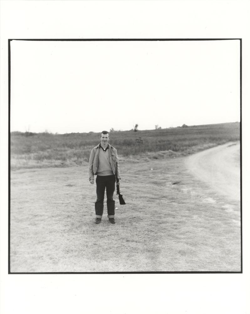 Limited edition semi-glossy 8 x 10 silver gelatin photograph of Oswald, on leave from the USMC, holding a rifle and smiling on the side of a rural road, numbered 20/50. The print was made by University Archives from a unique negative purchased directly from Lee Harvey Oswald's brother, Robert, in 2015. In very fine condition.