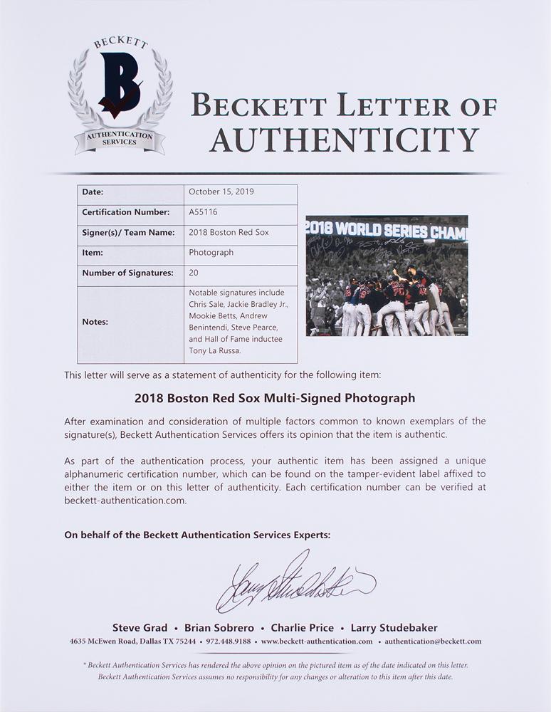 Color satin-finish 20 x 16 photo of the Boston Red Sox crowding together after defeating the Los Angeles Dodgers in Game 5 of the 2018 World Series, signed in silver ink by 20 members of the roster, including: Chris Sale, Jackie Bradley, Jr., Mookie Betts, Andrew Benintendi, Steve Pearce, Tony La Russa, David Price, Nathan Eovaldi, Sandy Leon, and more. In fine condition, with authenticity labels affixed to lower corners. Accompanied by a full letter of authenticity from Beckett Authentication Services.
