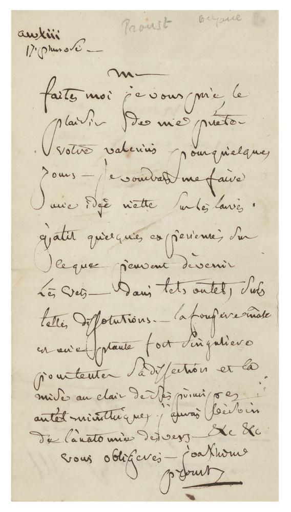 French chemist (1754-1826) known for his discovery of the law of constant composition, stating that chemical compounds always combine in constant proportions. ALS in French, signed “Proust,” one page, 3.75 x 7, no date. Untranslated letter to a professor of botany. In fine condition, with light creasing.