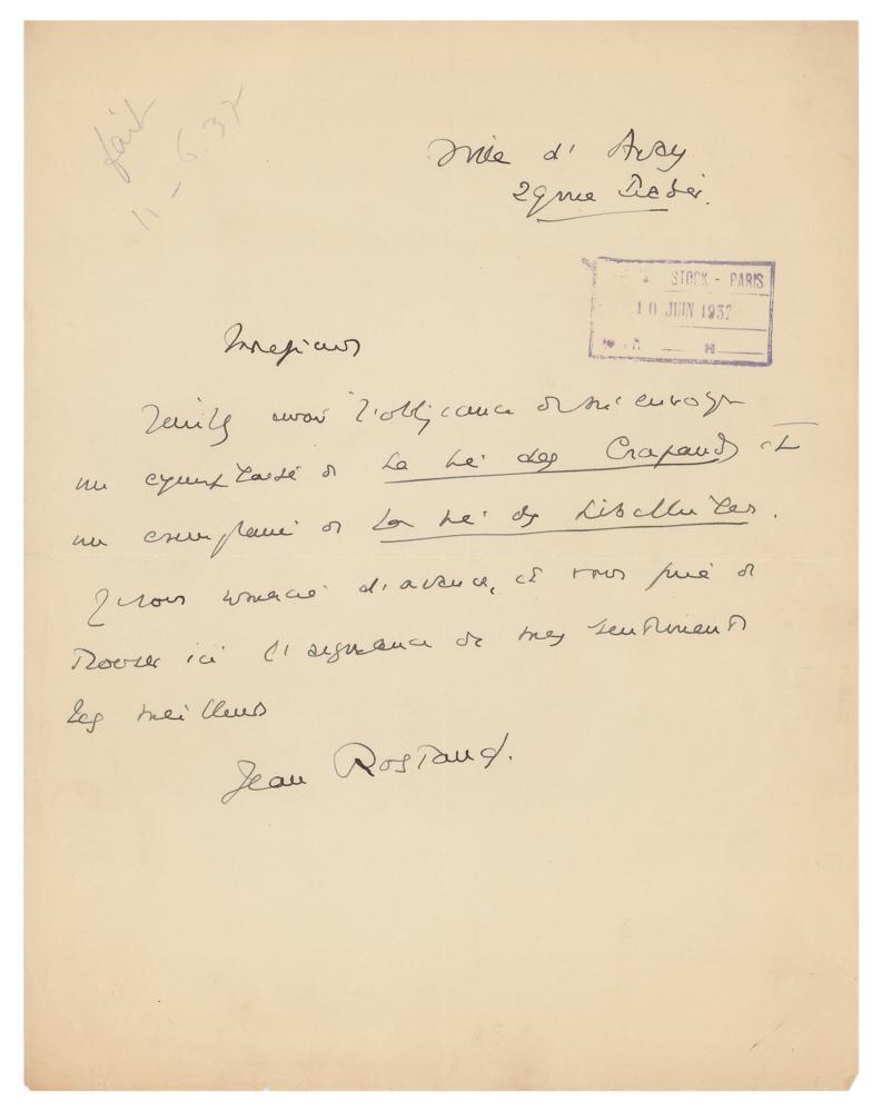 Jean Rostand Autograph Letter Signed