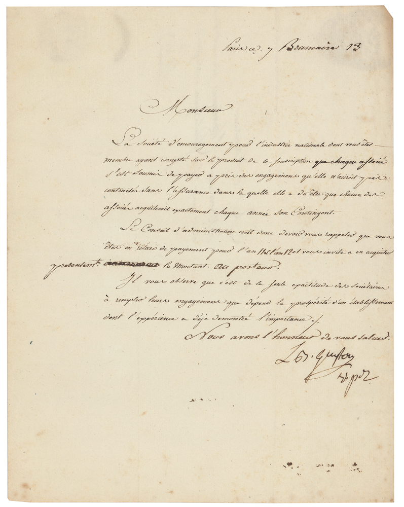 French chemist and politician (1737-1816) credited with producing the first systematic method of chemical nomenclature. LS in French, signed “L. B. Guyton,” one page, 7.25 x 9.25, October 29, 1804. Untranslated letter referencing the "Société d'encouragement pour l'industrie nationale." In fine condition.