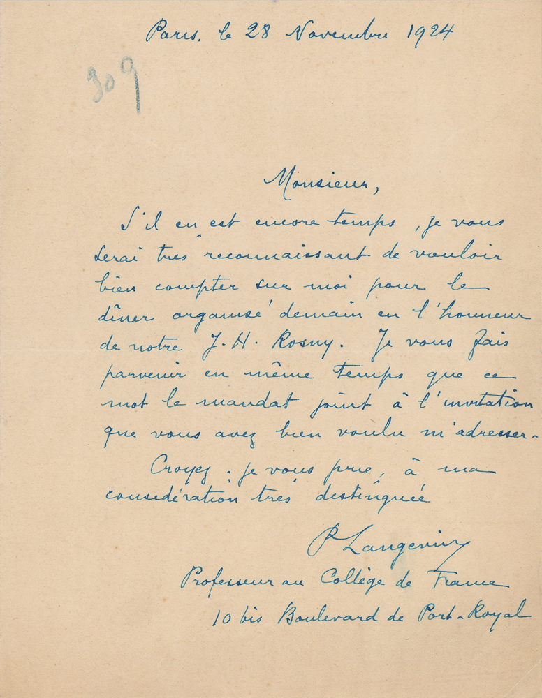 French physicist (1872-1946) who developed Langevin dynamics and the Langevin equation. ALS in French, signed “P. Langevin, Professeur au College de France,” one page, 5.5 x 7, November 28, 1924. Untranslated. In fine condition.