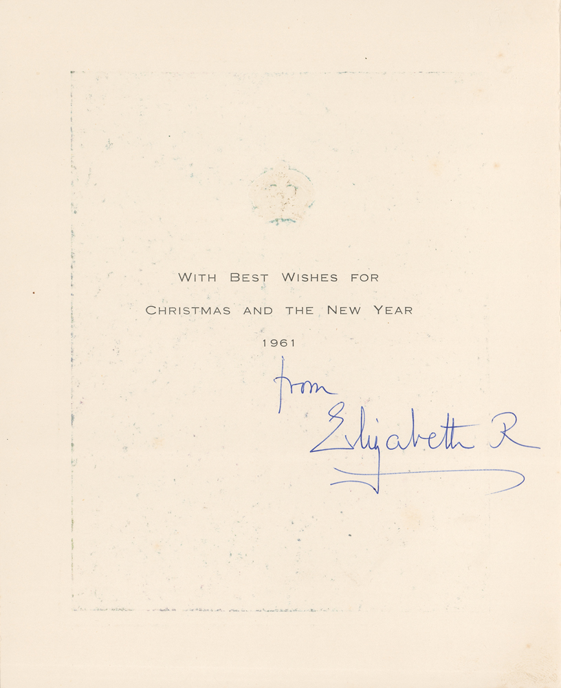 Desirable Royal Christmas card from 1961 with an embossed crown on the front, measuring 13.5 x 8.25 open, with the inside bearing an affixed image of the garden at Royal Lodge, signed on the adjacent page in blue ink, "from, Elizabeth R." In fine condition. This card originates from the personal collection of Jessie Robertson, who was formerly in Royal Service at Balmoral Castle for Queen Mary and later became Housekeeper at Sandringham House, Norfolk, England where she retired in 1956.