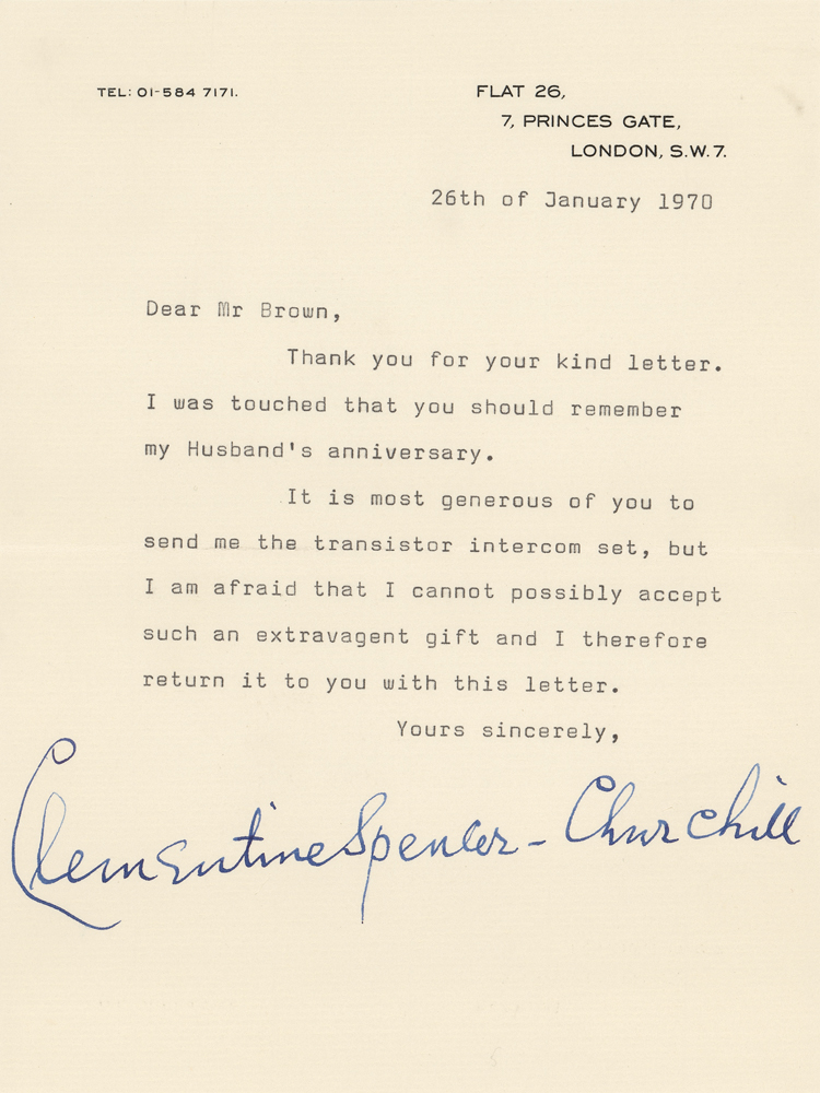 TLS signed “Clementine Spencer-Churchill,” one page, 6 x 8, personal letterhead, January 26, 1970. Letter to "Mr. Brown," in part: "I was touched that you should remember my Husband's anniversary. It is most generous of you to send me the transistor intercom set, but I am afraid that I cannot possibly accept such an extravagant gift and I therefore return it to you with this letter." In fine condition.