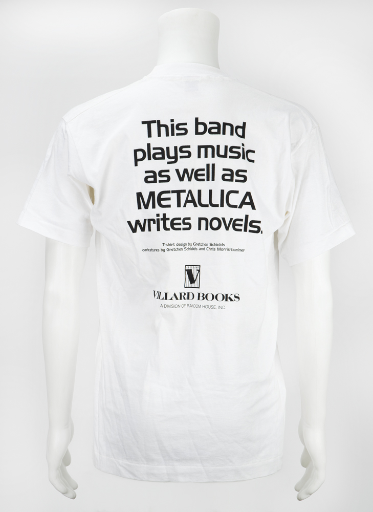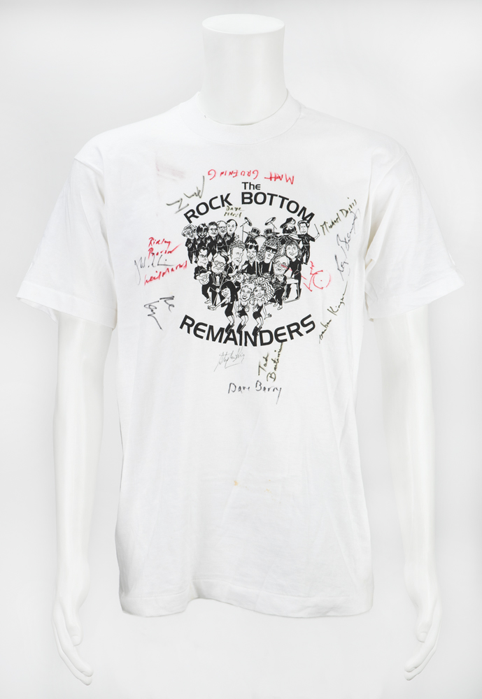 Large white t-shirt for the rock charity supergroup The Rock Bottom Remainders, with the front featuring a caricature of the full band, which is signed in black and red felt tip by 14 members, including: Stephen King, Matt Groening, Dave Barry, Amy Tan, Ridley Pearson, Joel Selvin, Roy Blount, Jr., Barbara Kingsolver, Robert Fulghum, Tad Bartimus, Al Kooper, Michael Dorris, Greil Marcus, and Dave Marsh. The back of the shirt reads: “This band plays music as well as Metallica writes novels.” The consignor notes that the signatures were obtained at a charity concert held at the Cowboy Boogie in Anaheim on May 25, 1992. In fine, never-worn condition, with a couple stains and smudges, and light haloing to black felt tip signatures. Accompanied by the original program from the concert, as well as by a letter of provenance from the original recipient, an in-house freelancer for the Los Angeles bureau of Newsweek Magazine who covered the concert.