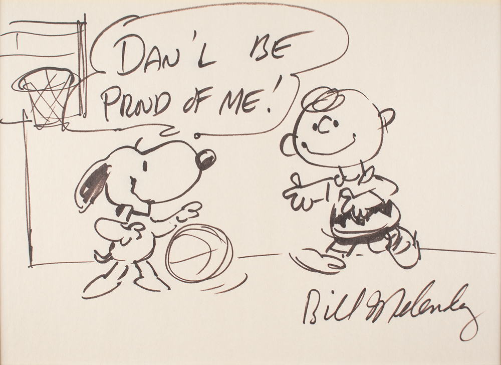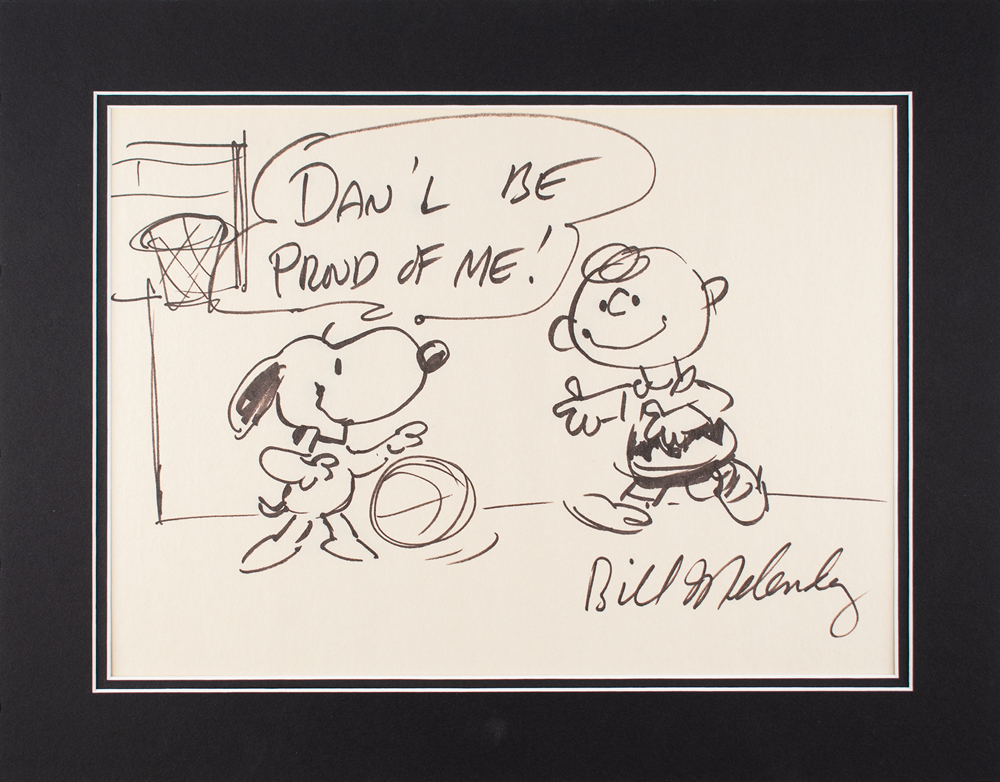 Original sketch of Snoopy and Charlie Brown by Bill Melendez, which shows the Peanuts pals playing basketball, with the dribbling pooch exclaiming in a speech bubble, "Dan'l be proud of me!" Accomplished in black felt tip on an off-white 14.5 x 10.5 sheet that is signed in the lower right. Double-matted to an overall size of 18.5 x 14.5. In fine condition.
