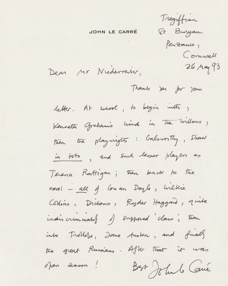 ALS, one page, 8 x 10, personal letterhead, May 26, 1993. Letter describing some of his favorite authors, in part: "At school, to begin with, Kenneth Graham's Wind in the Willows, then the playwrights: Galsworthy, Shaw in toto, and such lesser players as Terence Rattigan; then back to the novel—all of Conan Doyle, Wilkie Collins, Dickens, Ryder Haggard, quite indiscriminately of supposed 'class,' then into Trollope, Jane Austen, and finally the great Russians. After that it was open season!" In fine condition.