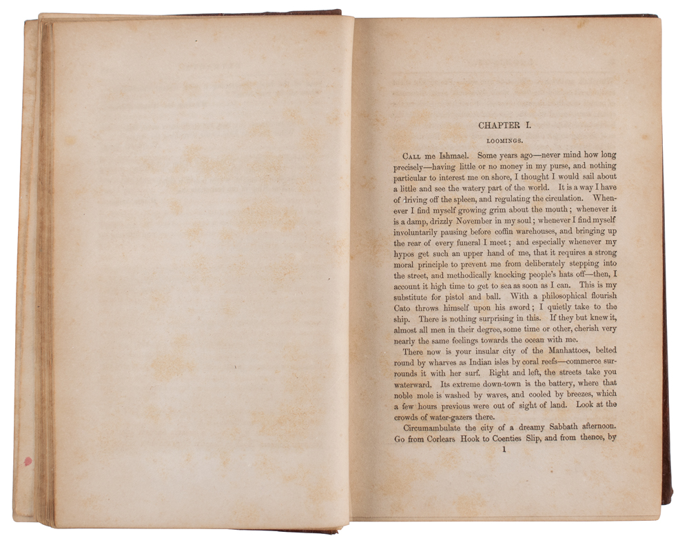 Established as a successful writer—having published seafaring adventures Typee, Omoo, Mardi, Redburn, and White-Jacket—Melville began writing Moby-Dick upon returning home from a trip abroad in February 1850. He completed the masterpiece over the course of the next 18 months, and it was first published in the autumn of 1851 with an American print run of 2,915 copies. Its opening sentence, "Call me Ishmael," stands among the most famous in all of literature. Despite initial poor sales, Moby-Dick was rediscovered after Melville's death and has since become known as one of the most original and influential books ever written. As a rare first edition of a cornerstone of American literature, this is an extraordinarily desirable example.