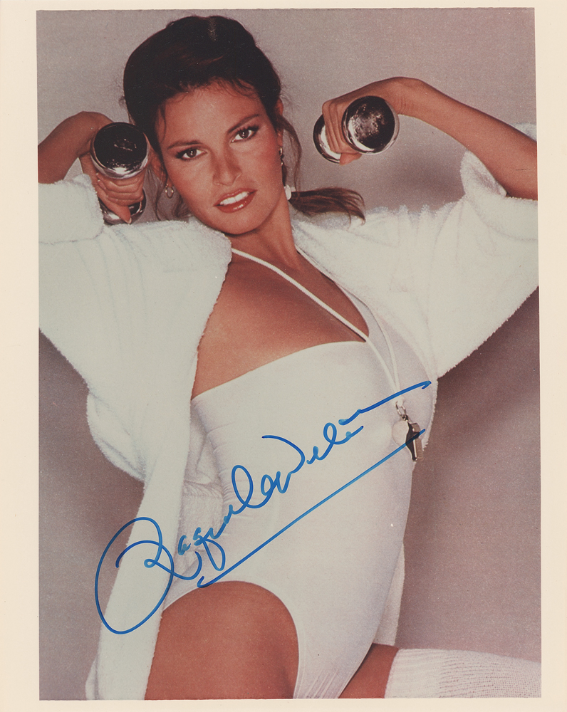 Color glossy 8 x 10 photo of Raquel Welch working out in a white robe and one-piece swimsuit, signed in blue felt tip. In fine condition. Originally obtained by in-person specialist Mike Wehrmann.