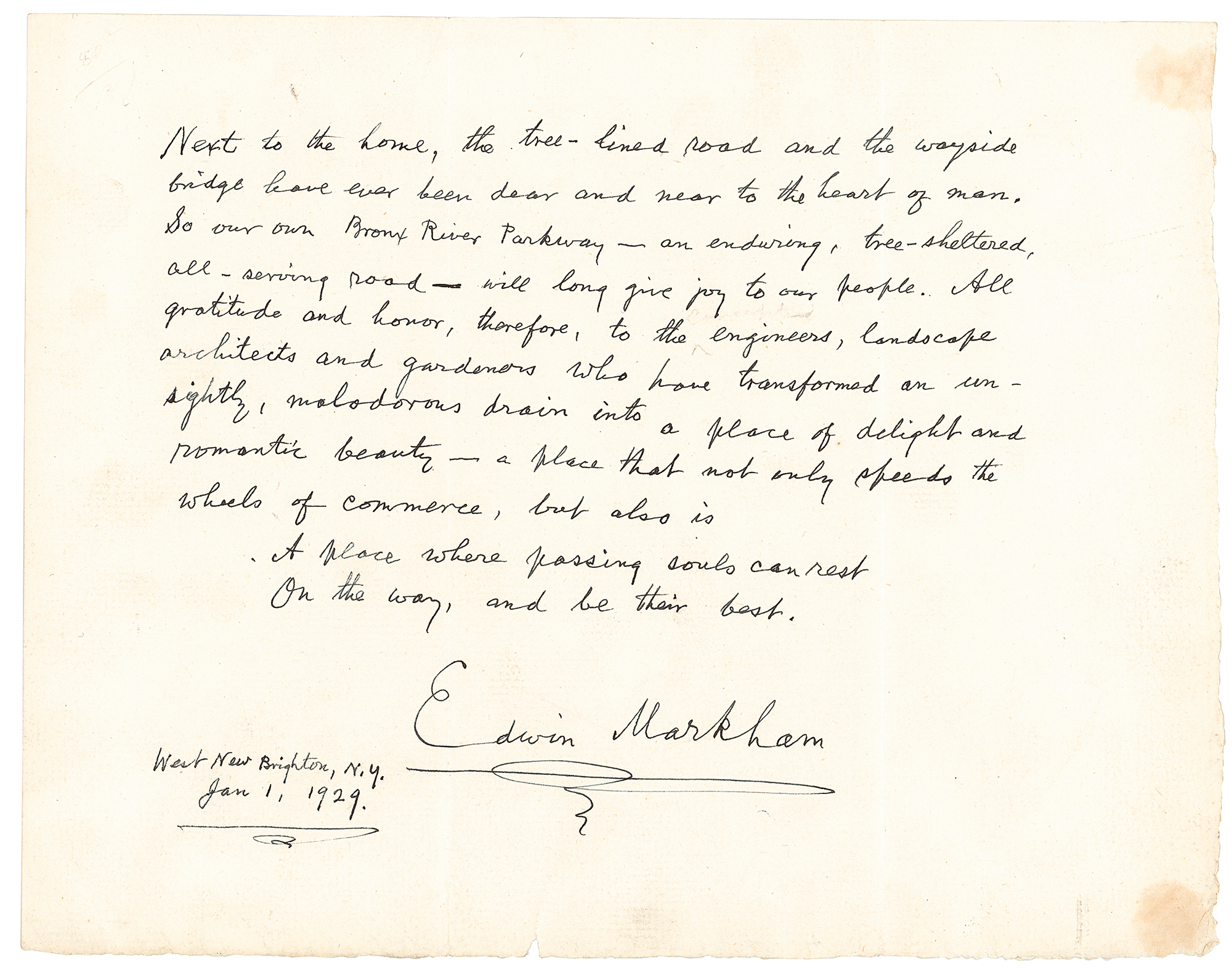 American poet and lecturer (1852-1940) whose poem 'Lincoln, the Man of the People' was presented at the dedication of the Lincoln Memorial. Autograph manuscript signed "Edwin Markham," one page, 10 x 8, West New Brighton, N.Y., January 1, 1929. Markham pays tribute to the Bronx River Parkway, in full: "Next to the home, the tree-lined road and the wayside bridge have ever been dear and near to the heart of man. So our own Bronx River Parkway—an enduring, tree-sheltered, all-serving road—will long give joy to our people. All gratitude and honor, therefore, to the engineers, landscape architects and gardeners who have transformed an unsightly, malodorous drain into a place of delight and romantic beauty—a place that not only speeds the wheels of commerce, but also is 'A place where passing souls can rest / On the way, and be their best.'" Markham draws from his own poem, 'A Prayer,' for the final couplet. In fine condition, with two vertical folds, and light stains to the two right corners.