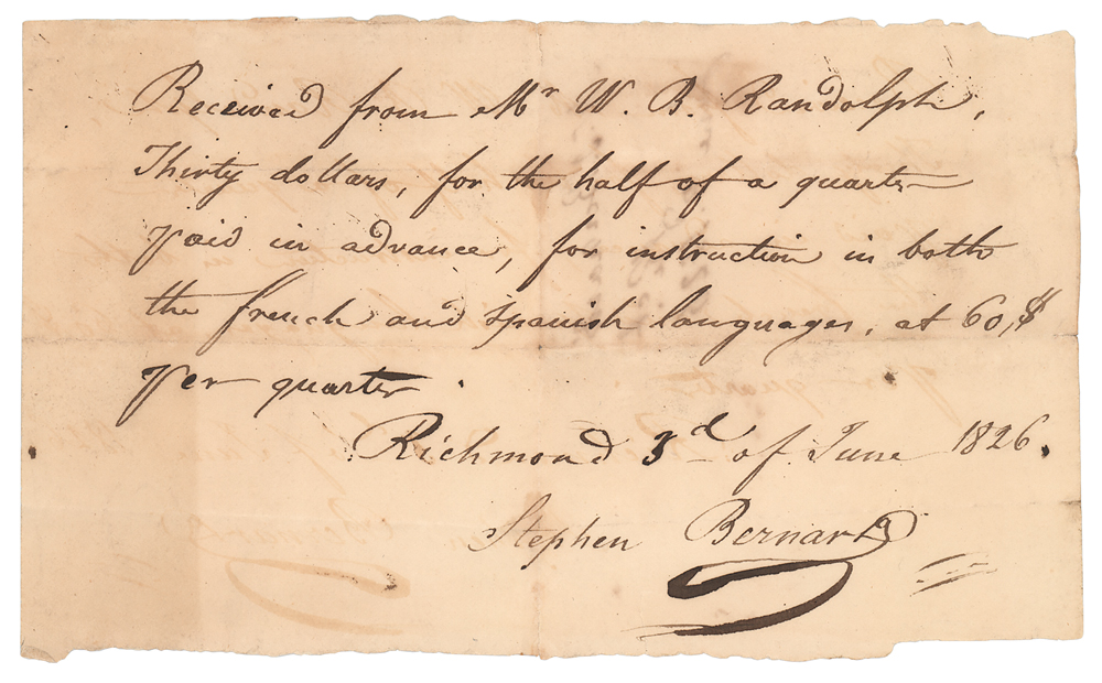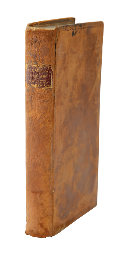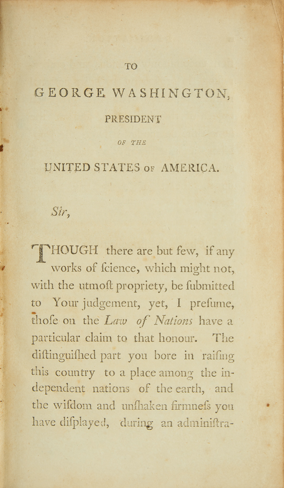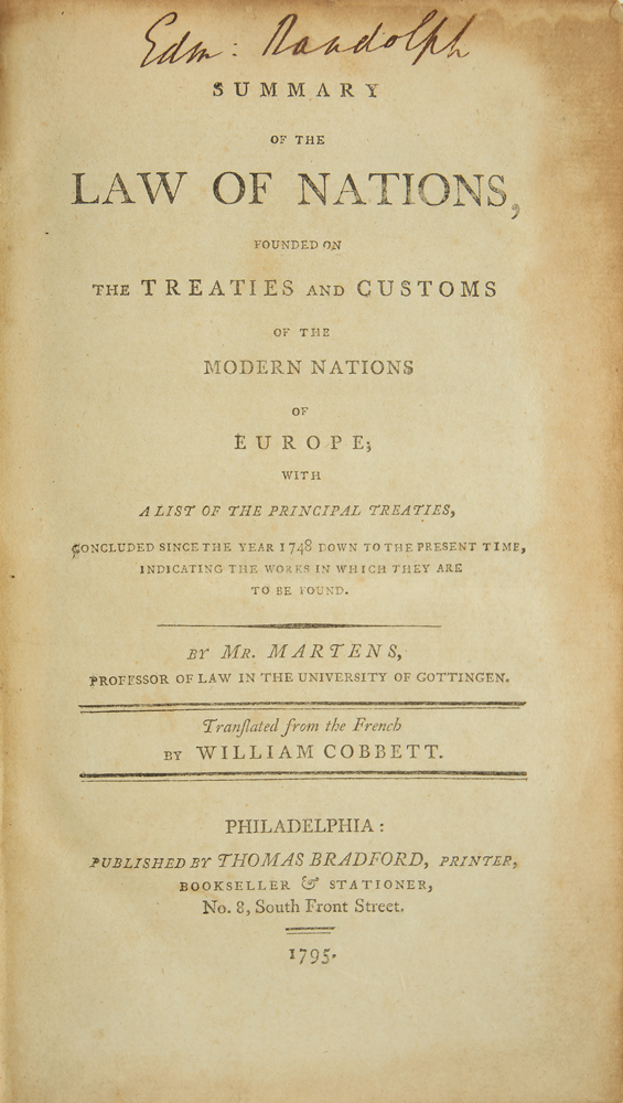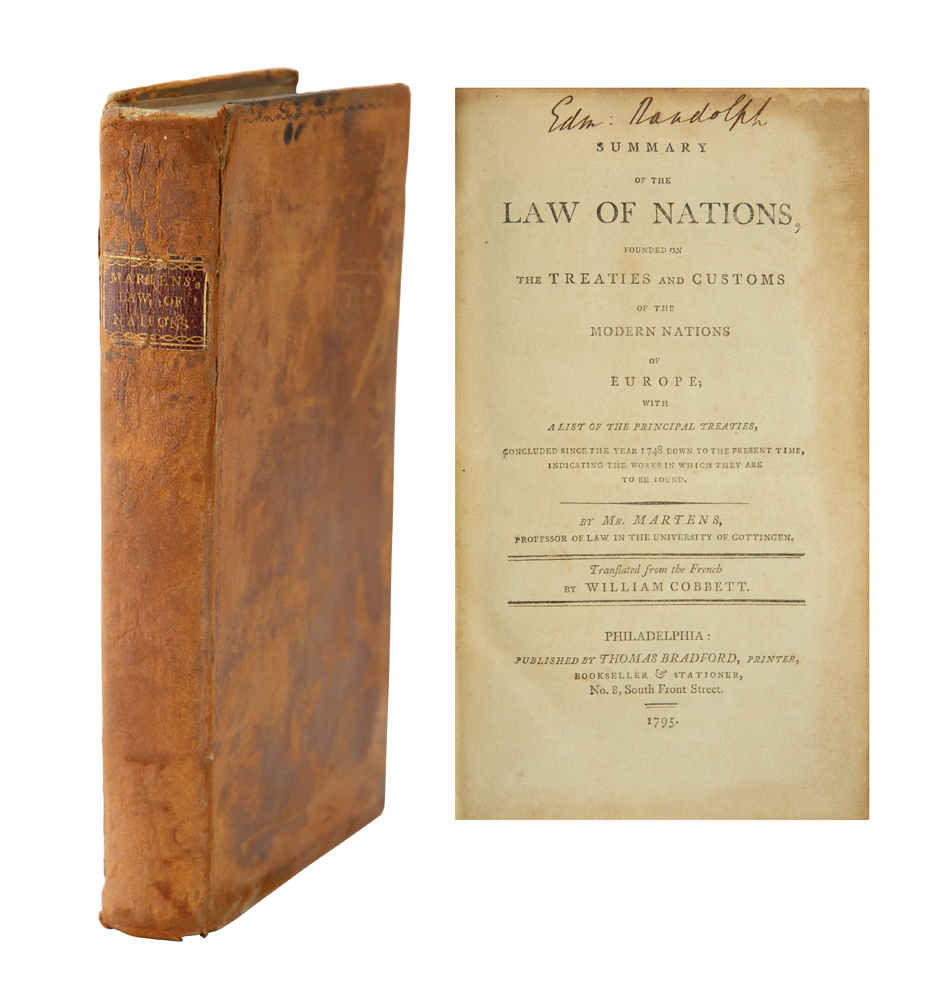 American politician (1753-1813) who served as both attorney general and secretary of state in George Washington's cabinet. Signed book: Summary of the Law of Nations, Founded on the Treaties and Customs of the Modern Nations of Europe, by Georg Friedrich von Martens. First American edition. Philadelphia: Thomas Bradford, 1795. Leatherbound hardcover, 5.25 x 8.5, 379 pages. Signed on the title page in ink with his ownership signature, "Edm. Randolph." Interestingly, the text is prefaced by the publisher's dedication to George Washington. The last pages of the book contain a list of subscribers, including Randolph himself, Aaron Burr, James Madison, and other notable political figures of the era. Autographic condition: very good to fine, with toning to the edges of the signed page. Book condition: VG-/None, with rubbing and scuffing to boards, and light foxing and toning to textblock. An 1826 Randolph family manuscript receipt for "instruction in both the French and Spanish languages" is loosely laid in, evidently used as a bookmark. An intriguing work on international law and politics from the personal library of one of America's distinguished early statesmen.