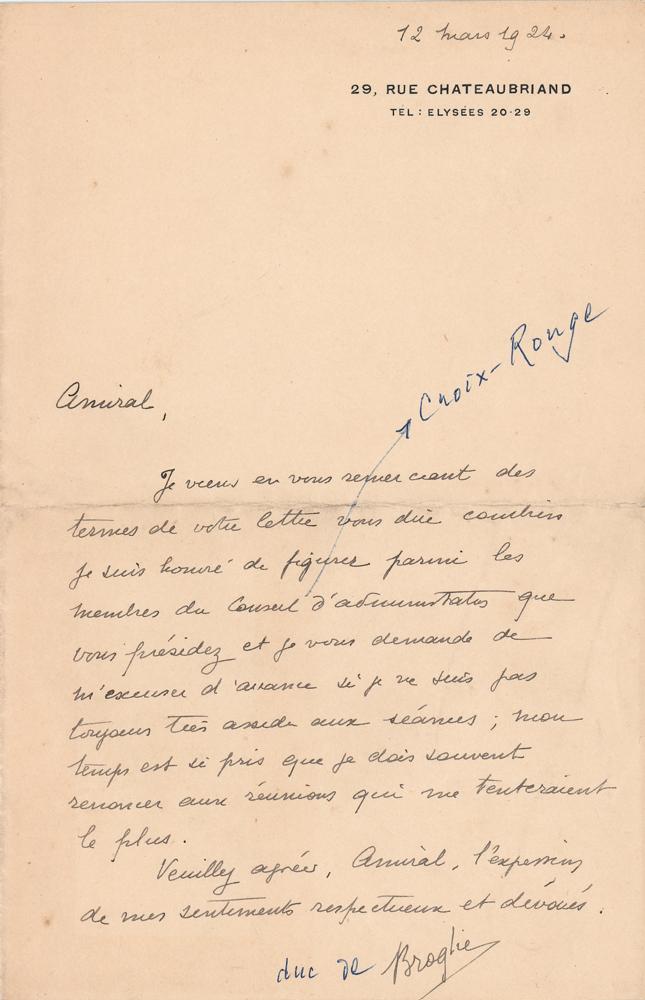 French physicist (1875-1960) who made advances in the study of X-ray diffraction, spectroscopy, and radio communications. ALS in French, signed “Broglie,” one page, 5.25 x 8.25, personal letterhead, March 12, 1924. Untranslated letter to an admiral. In fine condition, with two ballpoint notations added in an unknown hand.