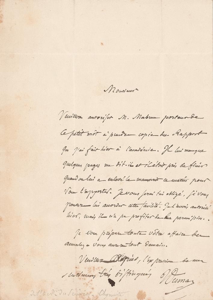 French chemist (1800-1884) best known for his work in determining atomic and molecular weights. ALS in French, signed “J. Dumas,” one page, 7 x 9.75, no date. In part (translated): "Please authorize Mr. Mabrun…to take a copy of the report I made here at the academy. He was missing a few pages…and he was ready to finish when he got the manuscript written." In fine condition, with some scattered staining.