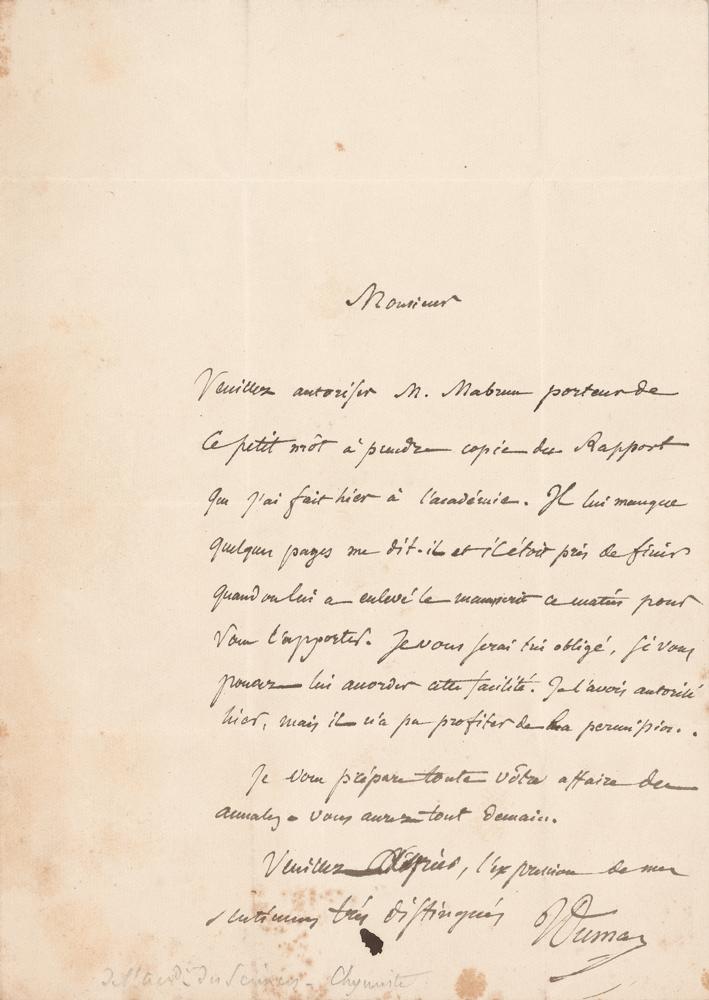 French chemist (1800-1884) best known for his work in determining atomic and molecular weights. ALS in French, signed “J. Dumas,” one page, 7 x 9.75, no date. In part (translated): "Please authorize Mr. Mabrun?to take a copy of the report I made here at the academy. He was missing a few pages?and he was ready to finish when he got the manuscript written." In fine condition, with some scattered staining.