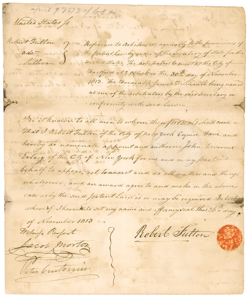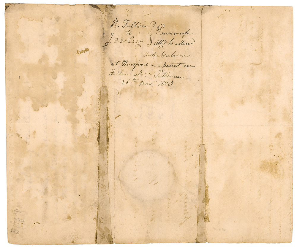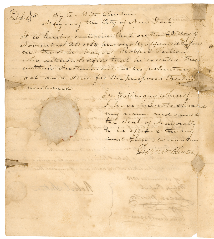 Manuscript DS, one page both sides, 8 x 9.75, November 26, 1813. Power of attorney document associated with a patent arbitration case in Hartford, by which Fulton authorizes "John Devereux Delacy of the City of New York for me and on my part and behalf to appear, act, transact and do all matter and things whatsoever, and an award agree to and make in the above case as by the said patent law is or may be required." Endorsed on the reverse by DeWitt Clinton, then the mayor of New York City. The affixed paper seal remains fully intact. In very good condition, with overall staining, and old repairs to the hinge and fold splits. The dispute with John Sullivan concerned Fulton's request for a patent 'for towing boats and warping them over rapids by means of their engines.' Despite the competency of Delacy, the arbitrators at Hartford found in favor of Sullivan and denied the patent.