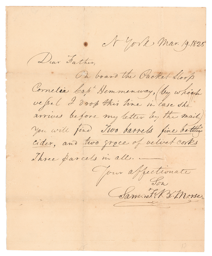 ALS signed “Your affectionate son, Sam. F. B. Morse,” one page, 7.75 x 9.5, March 19, 1825. Written from New York, a letter to his father, pastor and geographer Jedidiah Morse, in full: "On board the Packet Sloop Cornelia Capt. Hemmenway, (by which vessel I drop this line in case she arrives before my letter by the mail) you will find two barrels, five bottles cider, and two groce of velvet corks. Three parcels in all." In very good to fine condition, with some light creasing and staining. February of 1825 proved both fruitful and tragic for Morse and his family: he completed a commissioned painting of his hero, the Marquis de Lafayette; and his wife, Lucretia Pickering Walker, died of a heart attack just days after giving birth to their third child. Jedidiah, deemed by many as the 'father of American geography,' died at the age of 64 the following year.