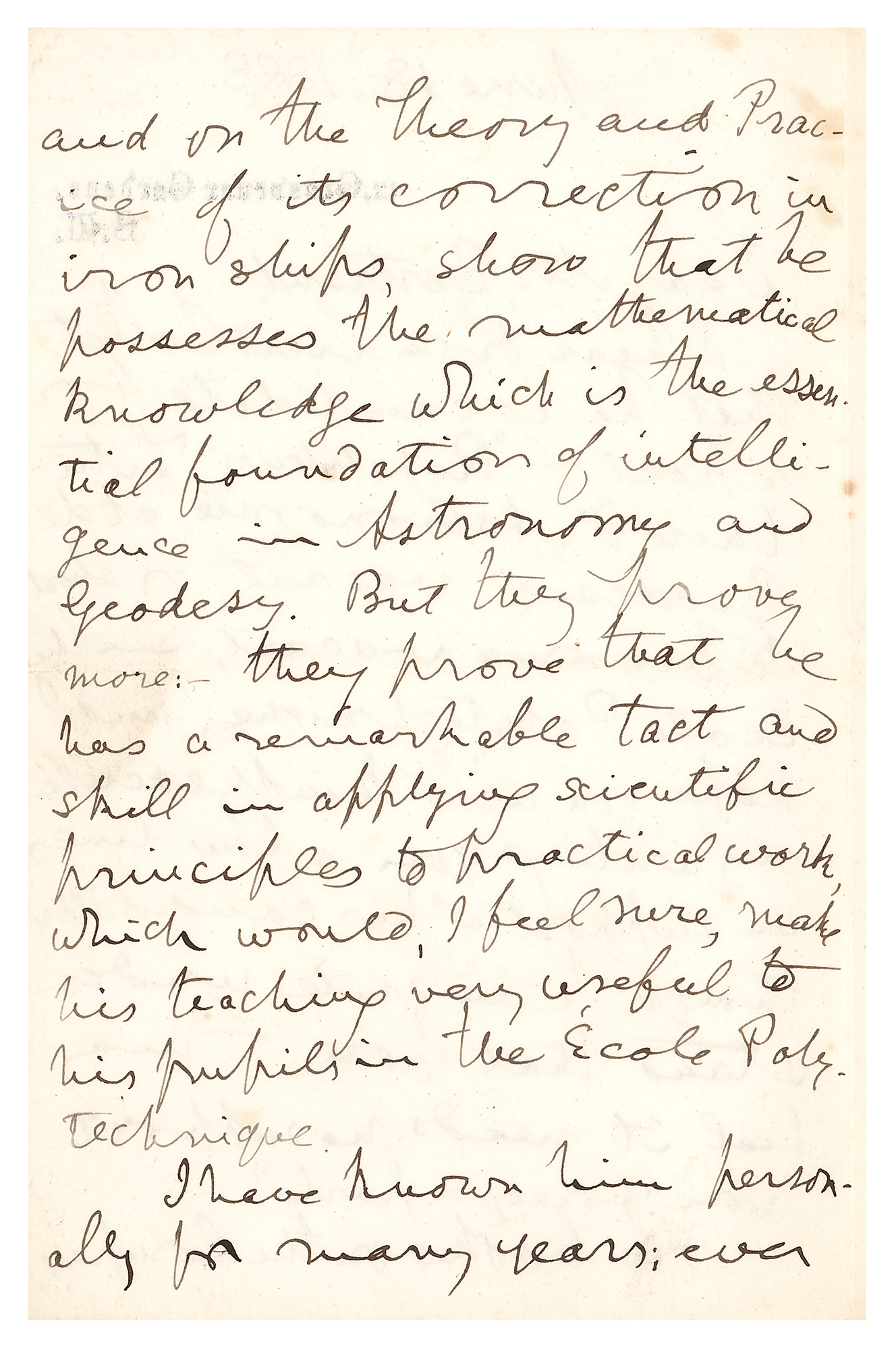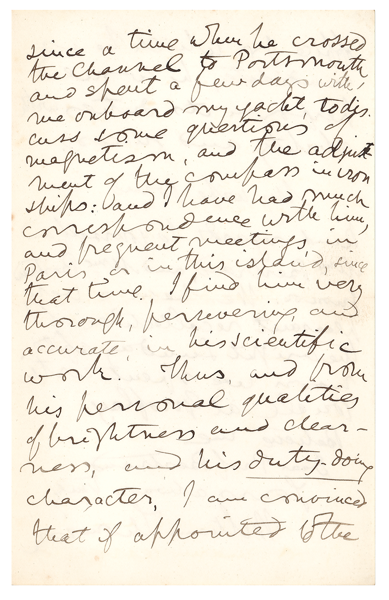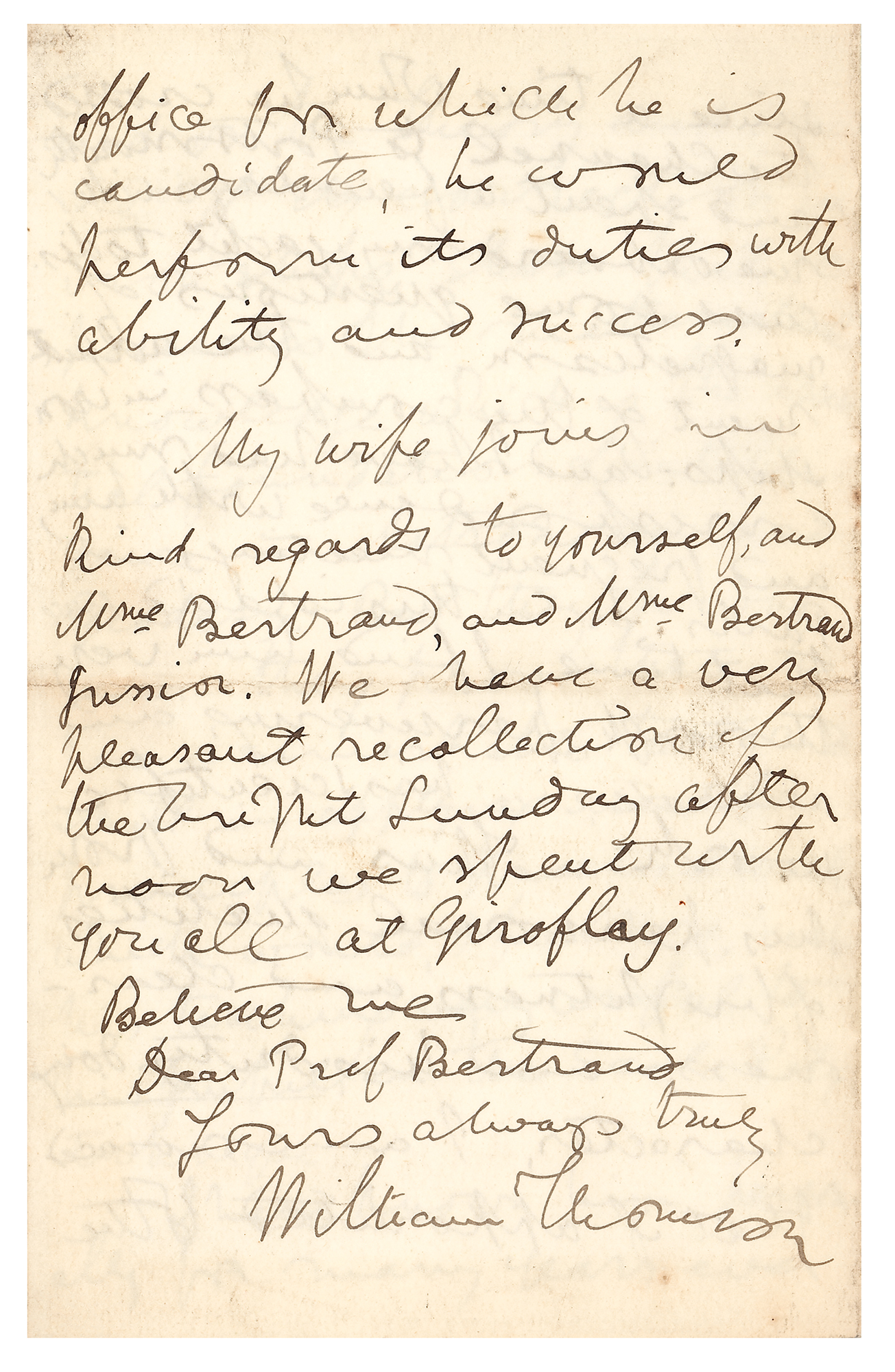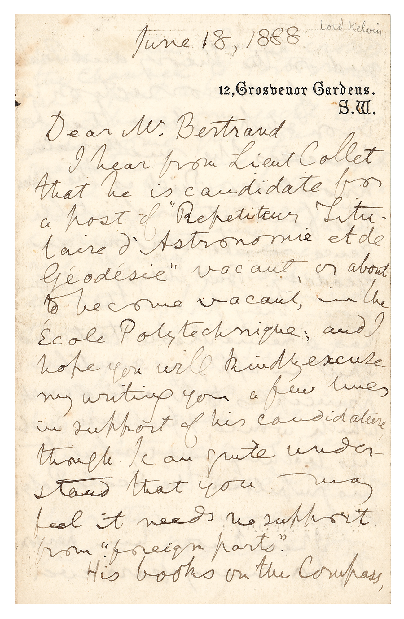 British mathematical physicist and engineer (1824-1907) who, as the Professor of Natural Philosophy at the University of Glasgow for 53 years, did important work in the mathematical analysis of electricity and formulation of the first and second laws of thermodynamics, and did much to unify the emerging discipline of physics in its modern form. He received the Royal Society's Copley Medal in 1883, was its President between 1890-1895, and in 1892 was the first British scientist to be elevated to the House of Lords. ALS signed “William Thomson,” four pages on two adjoining sheets, 4.5 x 7, 12 Grosvenor Gardens letterhead, June 18, 1888. Letter to Professor Bertrand, in part: "I hear from Lieut. Collet that he is candidate for a post of 'Repetiteur Titulaire d'Astronomie et de Geodesie' vacant, or about to become vacant, in the Ecole Polytechnique; and I hope you will kindly excuse my writing you a few lines in support of his candidature, though I can quite understand that you may feel it needs no support from 'foreign parts.' His books on the Compass and on the theory and practice of its correction in iron ships, show that he possesses the mathematical knowledge which is the essential foundation of intelligence in astronomy and geodesy. But they prove more:—they prove that he has a remarkable tact and skill in applying scientific principles to practical work which would, I feel sure, make his teaching very useful to his pupils in the Ecole Polytechnique." In fine condition.