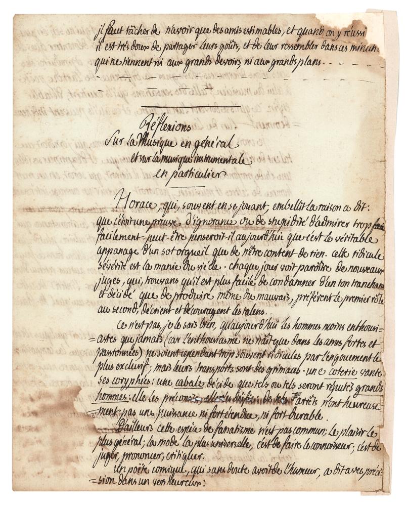 Controversial leader of the early stages of the French Revolution (1749-1791). Untranslated handwritten manuscript in French, unsigned, penned in the hand of Honoré Gabriel Riqueti, one page, both sides, 6.75 x 8.5, no date. One side appears to be the opening of an article entitled "Réflexions Sur La Musique en général et sur La Musique instrumentale en particulier" [Reflections on music in general and on instrumental music in particular]; the other side is marked "N'o 19" in the upper left corner. In very good to fine condition, with staining to the lower right corner, an old mounting strip along the left edge, and a numbering slip affixed to the upper left corner, which covers a small area of paper loss on the reverse.