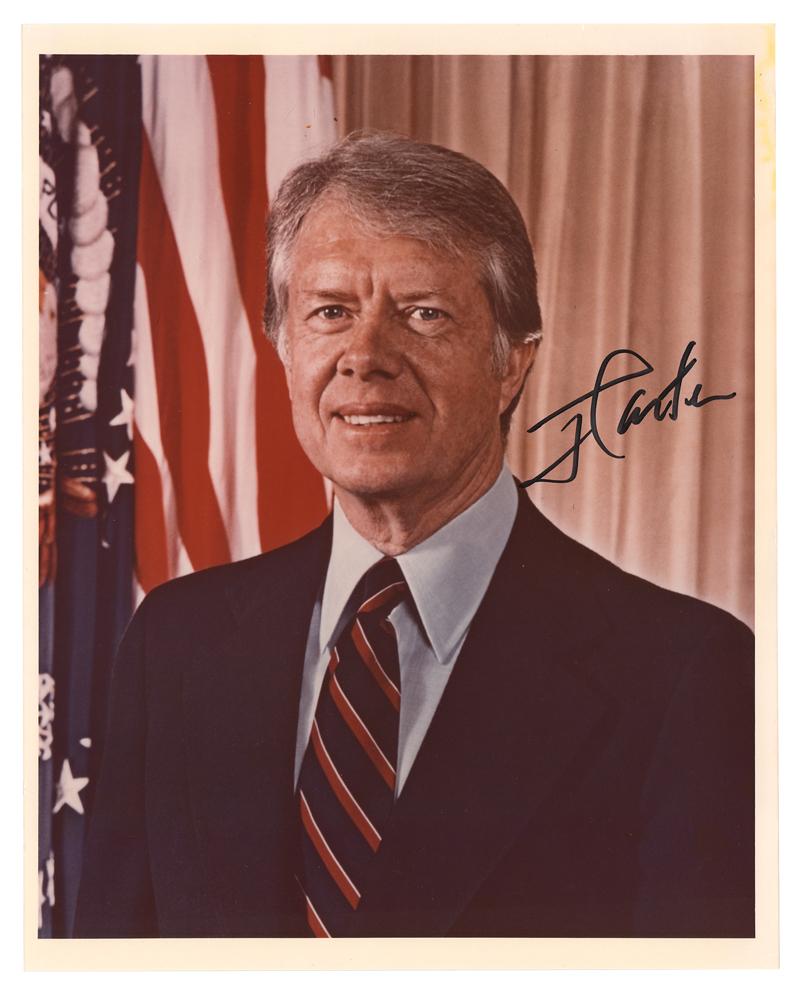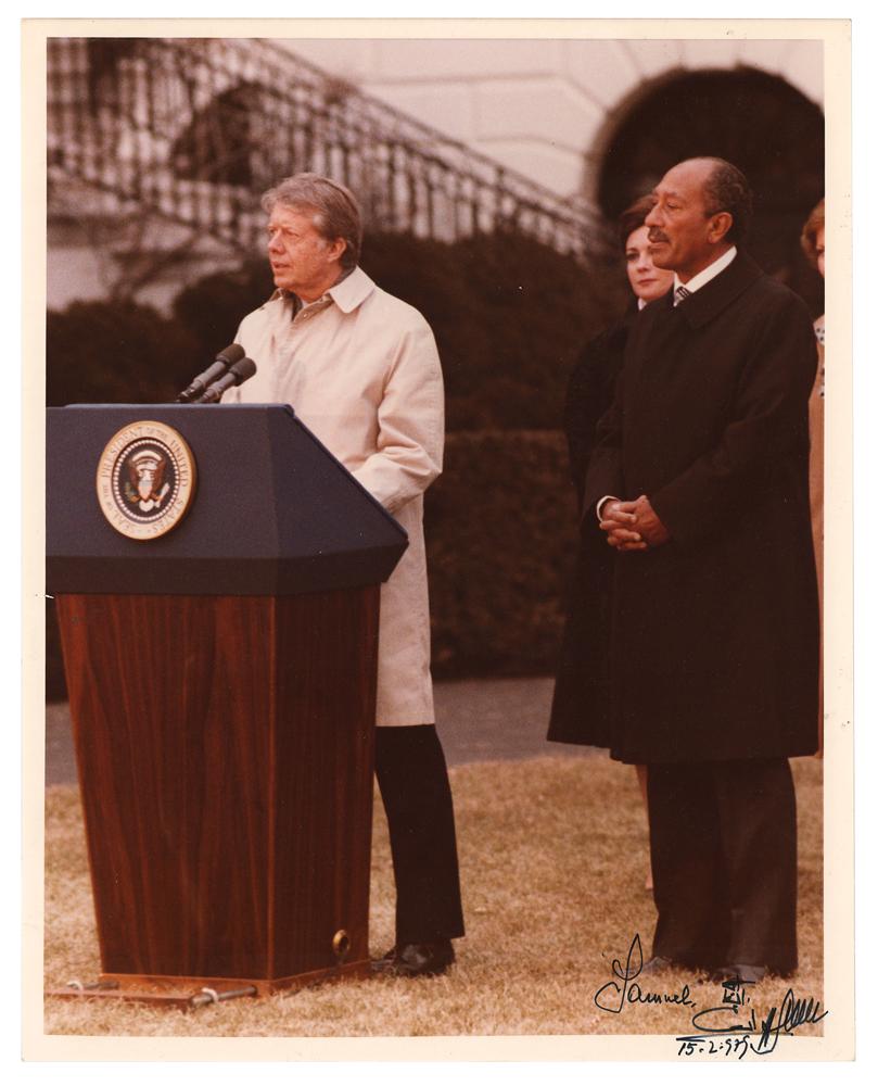 Two official color satin-finish 8 x 10 photos: one portrait of President Jimmy Carter, neatly signed in black felt tip, "J. Carter"; and one of President Carter at a podium beside Egyptian President Anwar Sadat, signed and inscribed in black felt tip by Sadat, and dated 1979. In overall fine condition, with minor discoloration to the border of the Carter portrait, and light creasing to an upper corner of the Sadat photo.