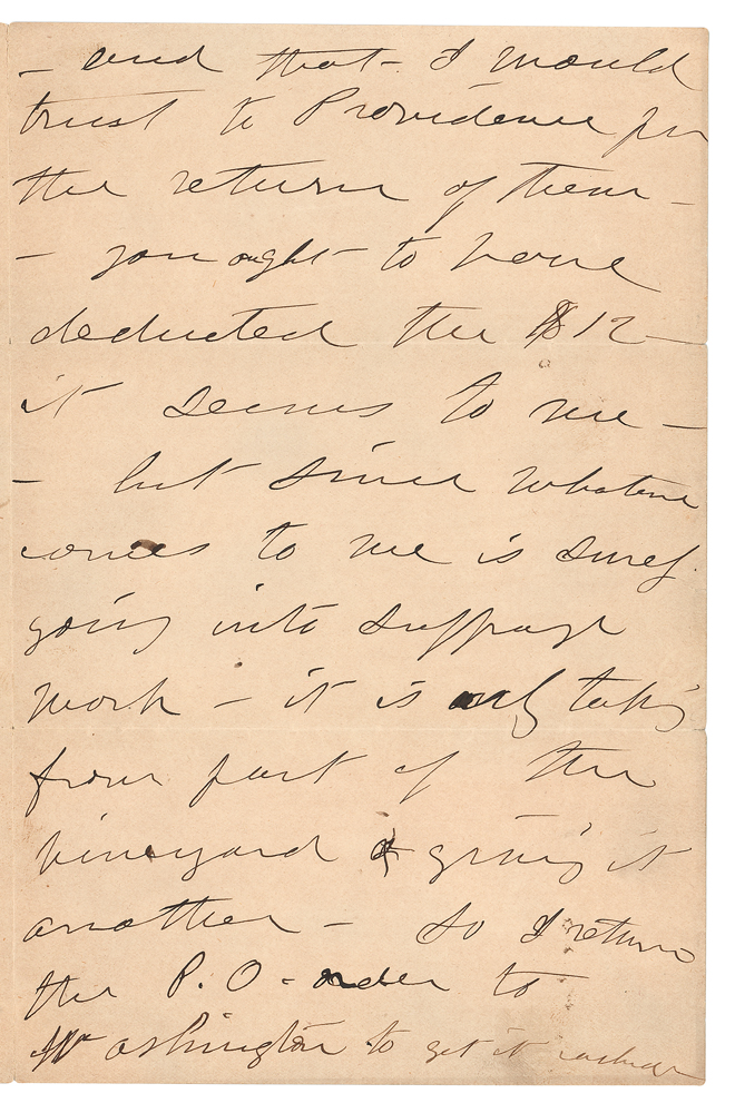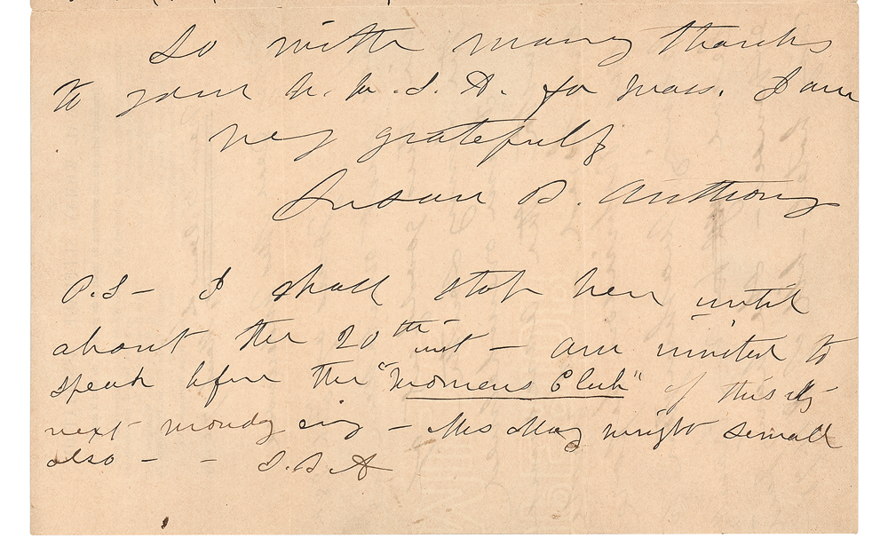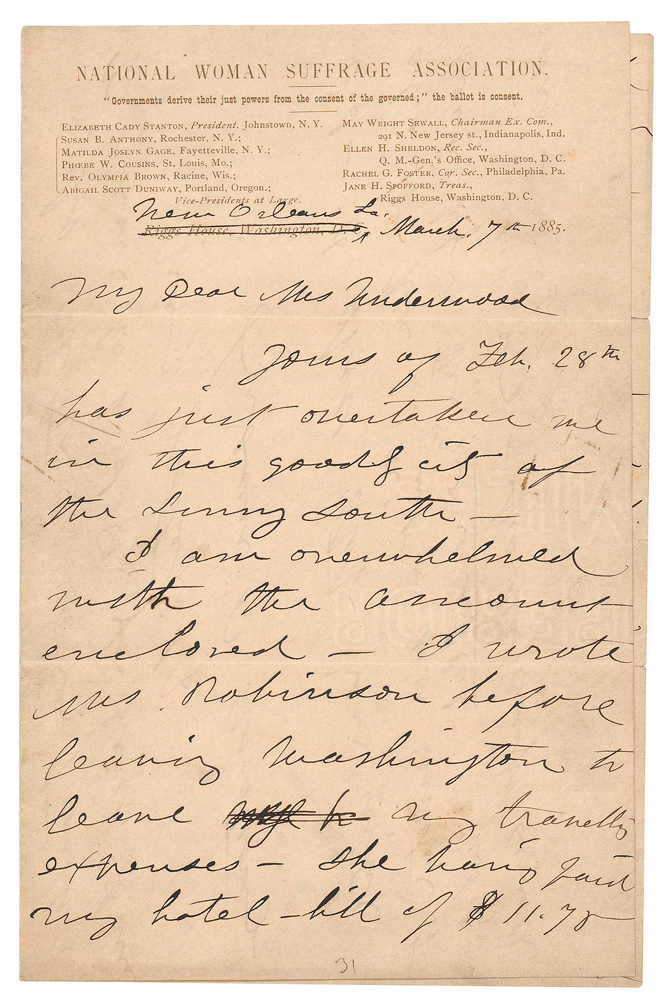 ALS, three pages on two adjoining sheets, 5.5 x 8.5, National Woman Suffrage Association letterhead, March 7, 1885. Written from New Orleans, a letter to Ms. Underwood, in part: "Yours of Feb. 28th has just overtaken me?I am overwhelmed with the amount enclosed. I wrote Ms. Robinson before leaving Washington to leave my travelling expenses. She having paid my hotel bill of $11.70—and that I would trust to providence for the return of them. You ought to have deducted the $12 it seems to me, but since whatever owes to me is surely going with suffrage work, it is only taking from part of the vineyard & giving it another." Anthony adds her initials "S.B.A" to the close of a postscript, "I shall stay here until about the 20th inst, am invited to speak before the 'Womens Club' of this city next Monday evening—Miss May Wright Sewall also." In fine condition.