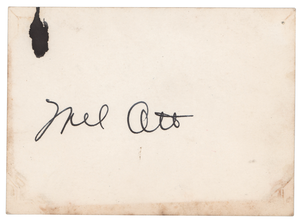 Bold and crisp vintage fountain pen signature, "Mel Ott,” on an off-white 3.5 x 2.5 card. In very good to fine condition, with a stain to the upper left corner, and light toning along the bottom, all easily matted out.