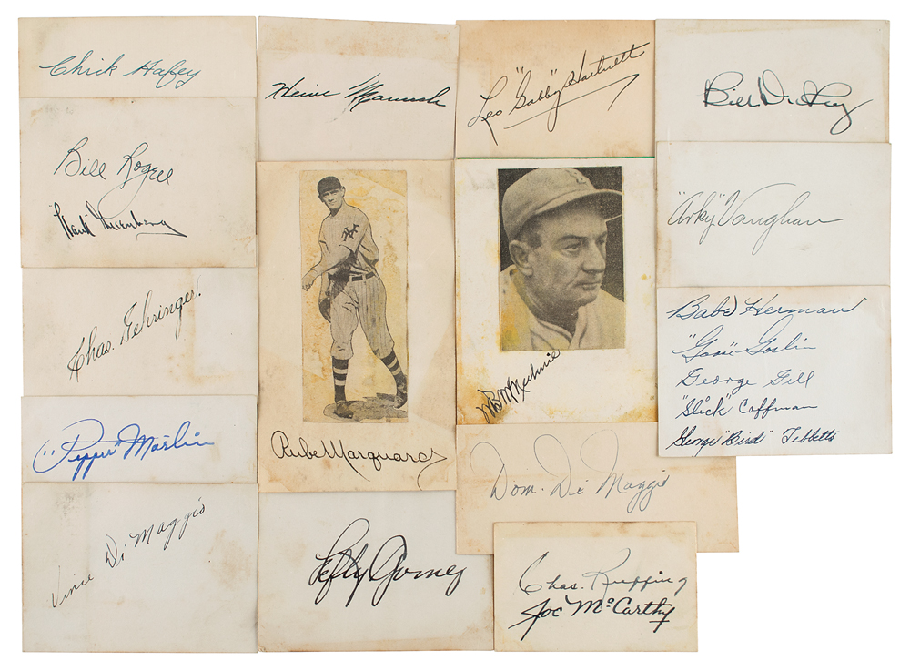 Collection of vintage fountain pen signatures of baseball stars on cards ranging in size from 3 x 2 to 3.25 x 4.25, including: Chas. 'Red' Ruffing and Joe McCarthy; Babe Herman, Goose Goslin, George Gill, 'Slick' Coffman, and George 'Birdie' Tebbetts; Gabby Hartnett; Dom DiMaggio; Vince DiMaggio; Heinie Manush; Pepper Martin; Bill Dickey; Hank Greenberg and Bill Rogell; Bill McKechnie; Arky Vaughan; Charles Gehringer; Lefty Gomez; Chick Hafey; and Rube Marquard. In overall very good to fine condition, with soiling, toning, and/or staining to all of the cards.