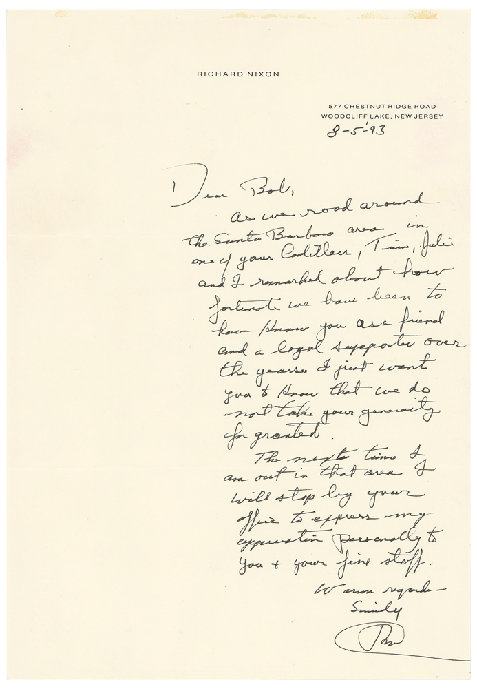 ALS signed “RN,” one page, 7.25 x 10.5, personal letterhead, August 5, 1993. Letter to old friend and car dealer Bob Nesen, in full: "As we road [sic] around the Santa Barbara area in one of your Cadillacs, Tricia, Julie and I remarked about how fortunate we have been to have known you as a friend and a loyal supporter over the years. I just want you to know that we do not take your generosity for granted. The next time I am out in that area I will stop by your office to express my appreciation presently to you & your fine staff." In fine condition, with a thin strip of old tape residue along the top edge. Accompanied by the original mailing envelope.