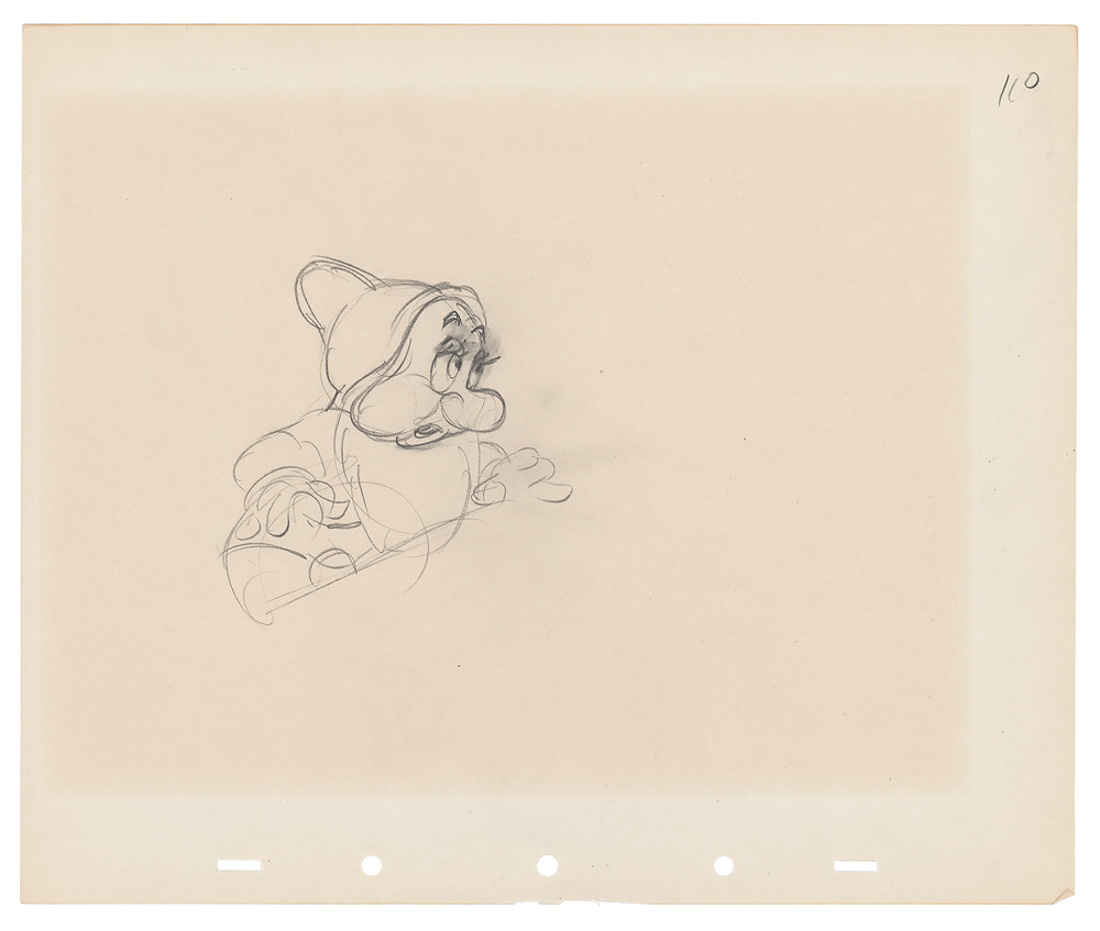 (Walt Disney Studios, 1937) Original production drawing of Bashful from Snow White and the Seven Dwarfs, which shows the reticent dwarf in a half-length pose. Accomplished in graphite on untrimmed 12 x 10 animation paper marked "110" in the upper right corner. Image measures 4 x 4. In fine condition, with a box of toning from previous display. Accompanied by a certificate of authenticity from Seaside Art Gallery.