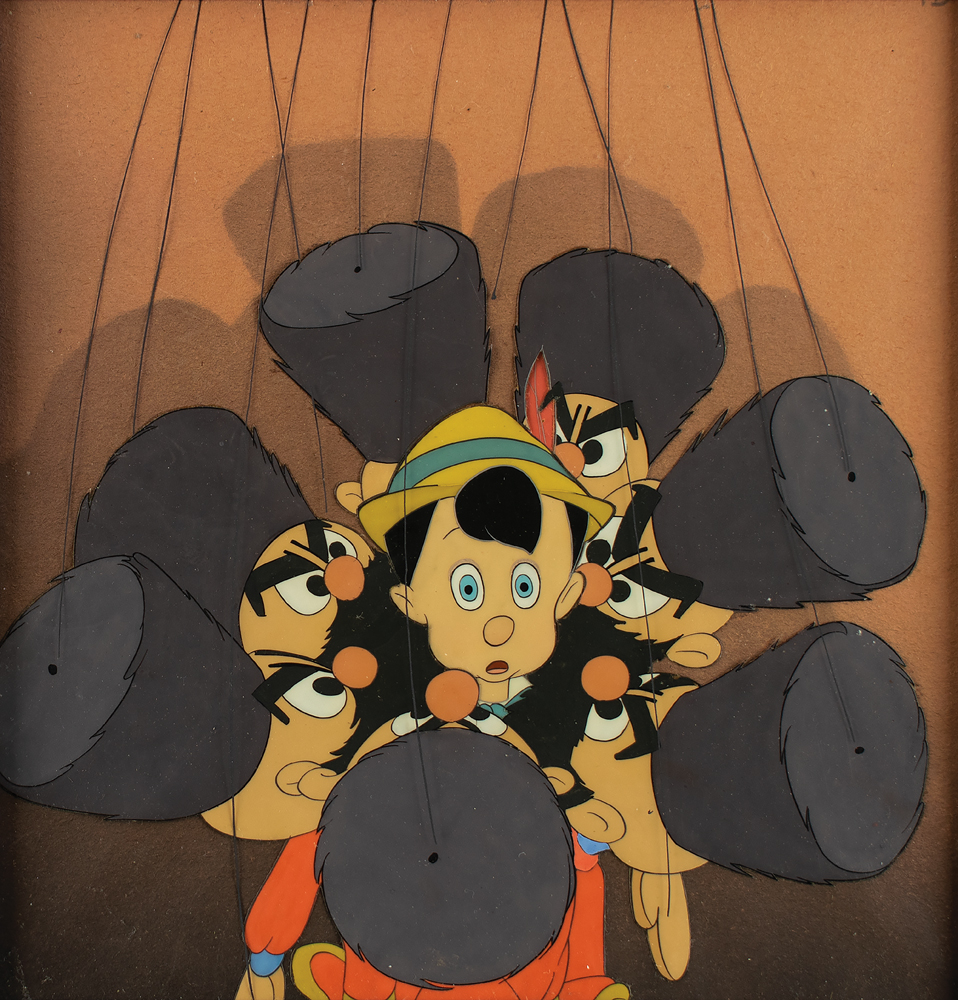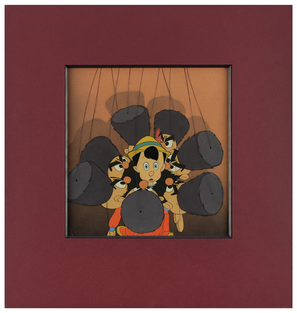 (Walt Disney Studios, 1940) Rare original production cel of Pinocchio and a group of Cossack marionettes from Pinocchio, which shows the boy-puppet surrounded by several strung soldier puppets during the memorable 'I've Got No Strings' musical sequence. The cel has been trimmed and applied to an airbrushed background as prepared by Courvoisier Galleries for sale. Total character image measures 7.55 x 8, which fills the entirety of the mat opening. Matted to an overall size of 13.75 x 14.5. The piece has half of the original Disney Courvoisier Galleries label on the reverse. In fine condition.