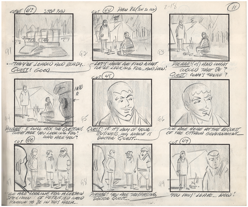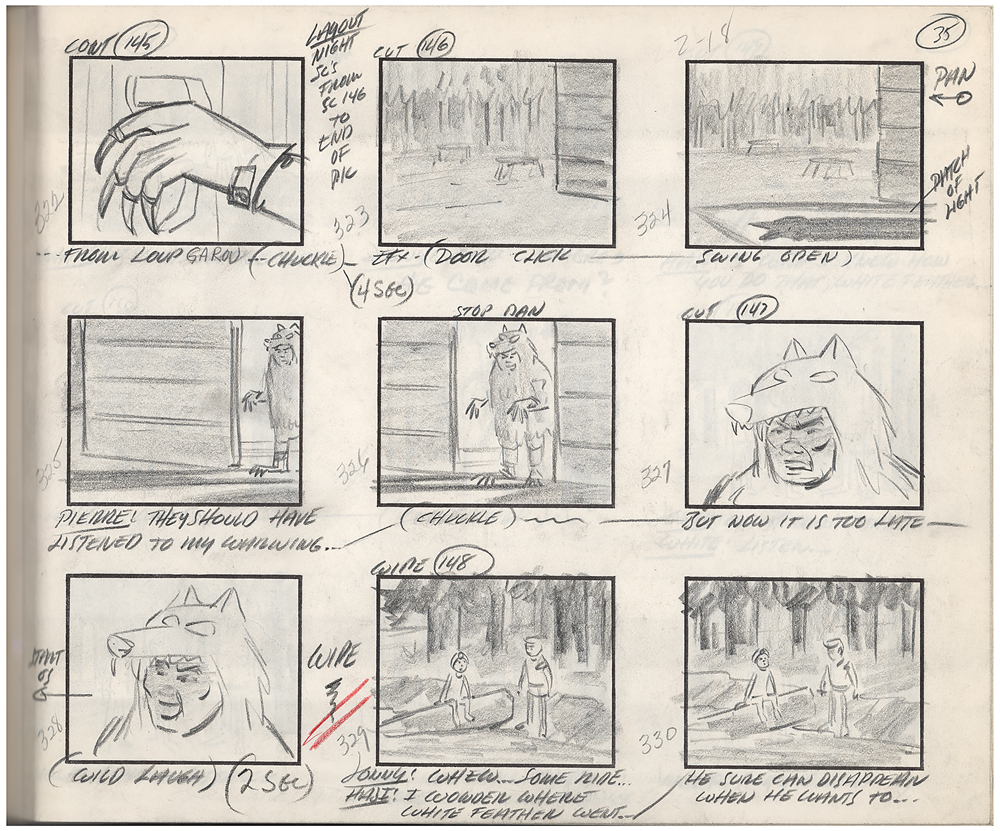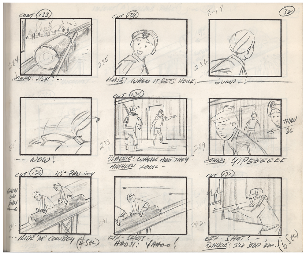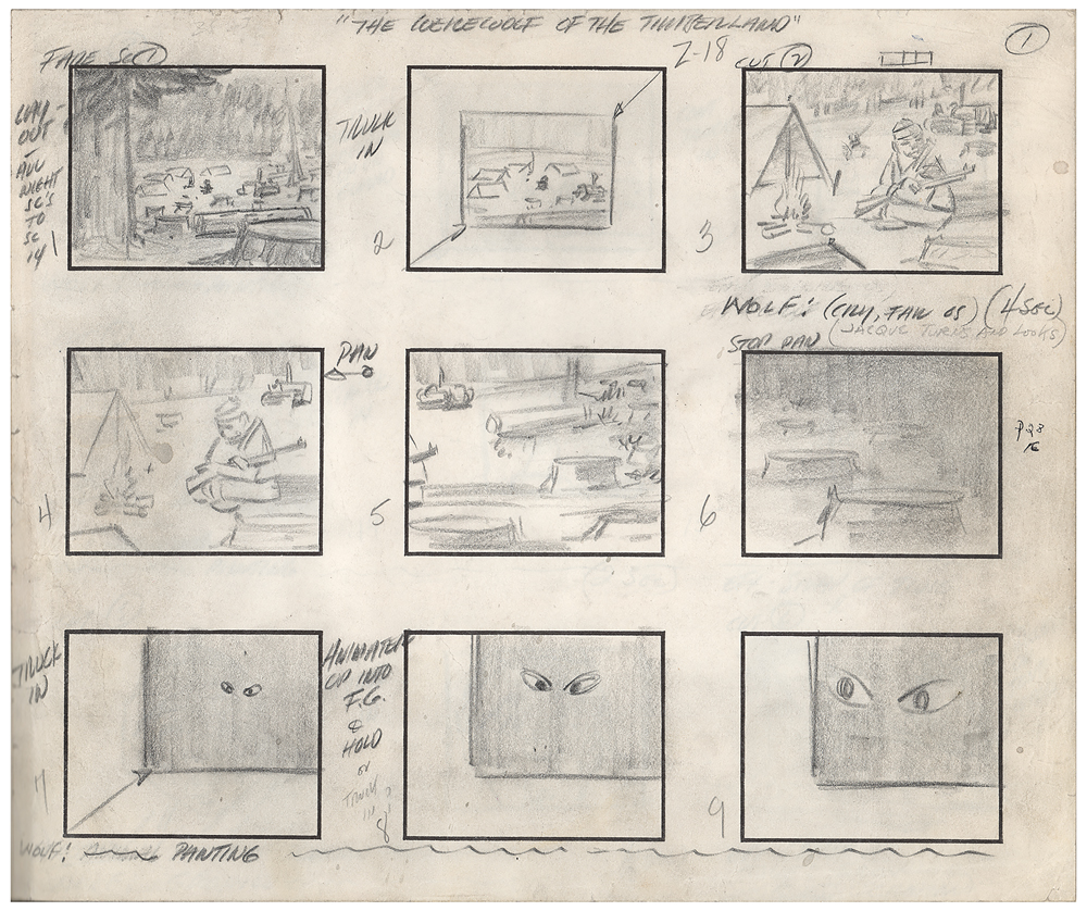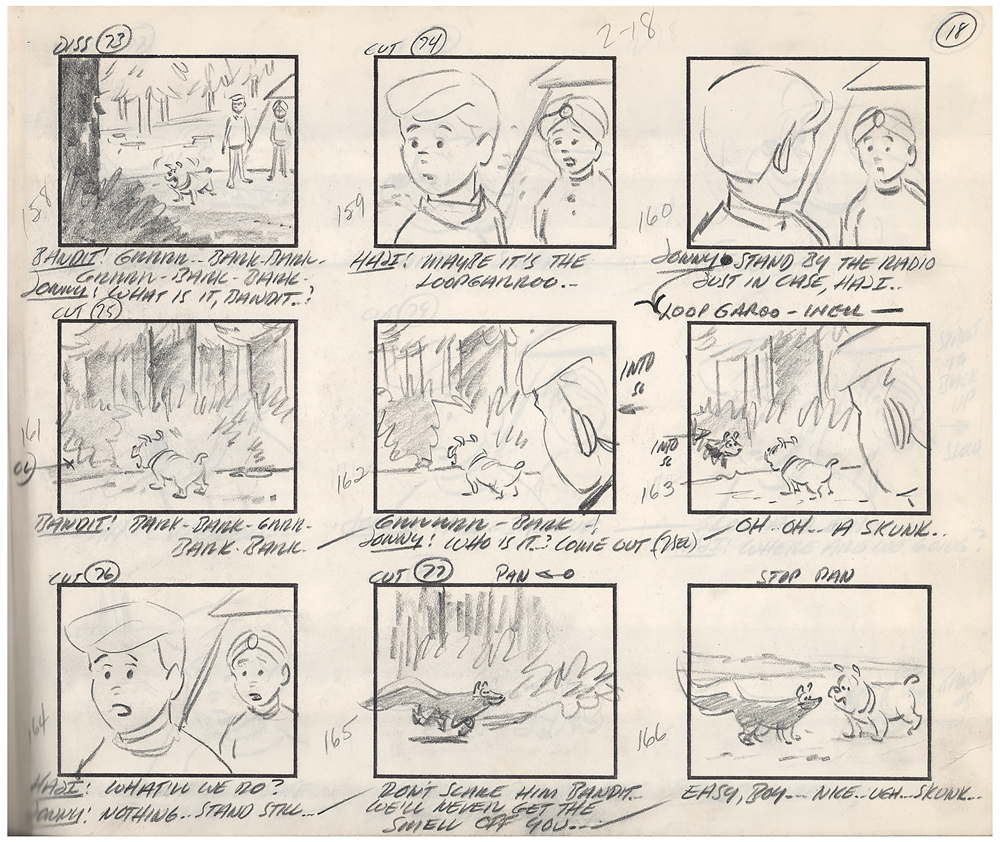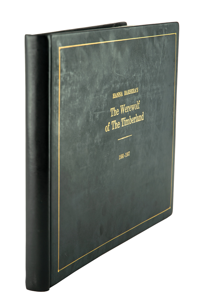 (Hanna-Barbera, 1964) Original complete 50-page hand-drawn storyboard for the Jonny Quest cartoon The Werewolf of the Timberland, the 17th episode of the first season, which aired on January 7, 1965. The storyboard contains 50 pages and a total of 464 drawings, which amounts to roughly nine drawings per page, with the majority bearing scene notes and directions. Each storyboard page is accomplished in graphite on untrimmed 12.5 x 10.5 animation paper. The storyboard has been expertly tipped into a handsome leather-bound presentation book, 13.75 x 10.75, with gilt titling to front cover: “Hanna Barbera’s The Werewolf of The Timberland, 1956-1957”; it’s unknown why the date on the binding is several years prior to the actual production of this episode. In fine condition, with expected wear from use. In the episode, Dr. Quest, Jonny, Race, Hadji, and Bandit go up against a band of French-Canadian smugglers who mask their nefarious dealings by concocting a fake werewolf to scare off intruders. A fascinating and rare inside look at the story and animation process in the early days of Hanna-Barbera studio.