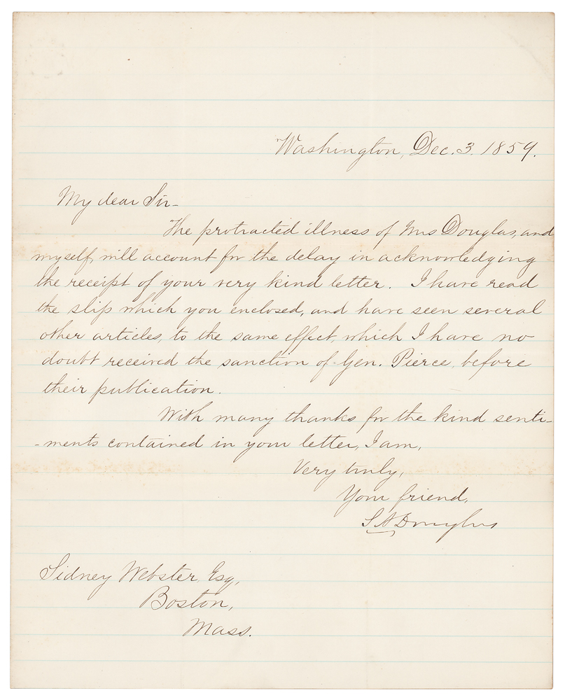 Eminent American senator and statesman (1813-1861), dubbed the 'Little Giant,' perhaps best remembered for his role in the Lincoln-Douglas debates during the 1858 campaign for the Senate race in Illinois. ALS signed “S. A. Douglas,” one page, 7.75 x 9.75, December 3, 1854. Letter to Sidney Webster, who had been the private White House secretary to President Franklin Pierce. In part: "The protracted illness of Mrs. Douglas, and myself, will account for the delay in acknowledging the receipt of your very kind letter. I have read the slip which you enclosed, and have seen several other articles, to the same effect, which I have no doubt received the sanction of Gen. Pierce,before their publication." In fine condition, with faint toning along the horizontal folds.
