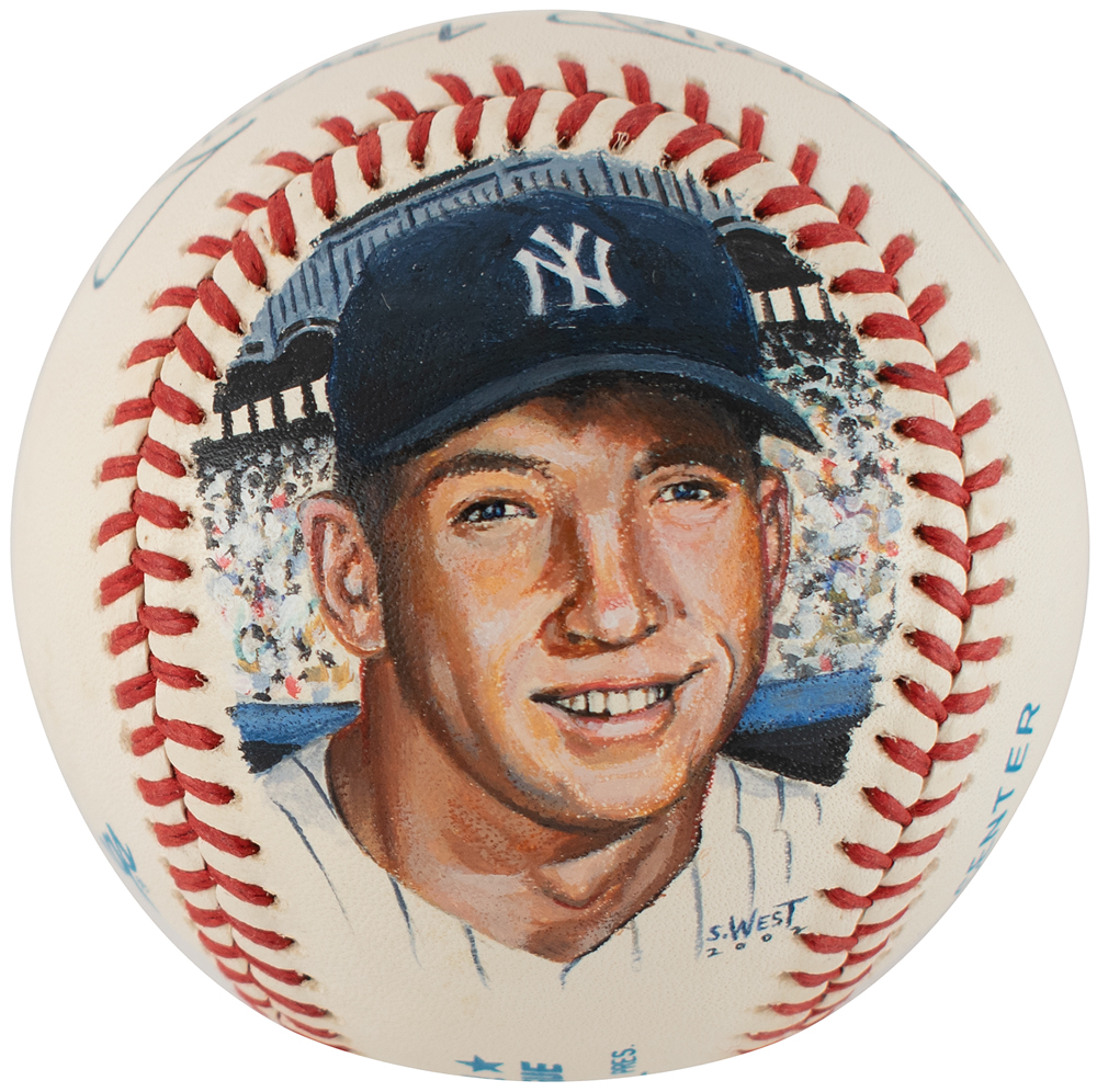Official Rawlings American League (Brown) baseball signed in blue ballpoint on the sweet spot, "Mickey Mantle," with a fabulous hand-painted portrait of the Yankees legend on the lower panel, signed and dated by the artist, "S. West, 2002." In very fine condition.