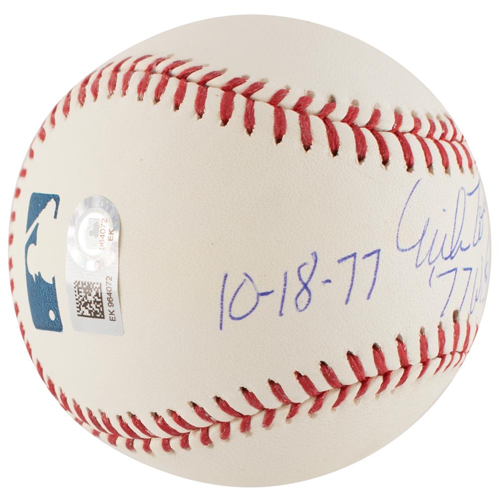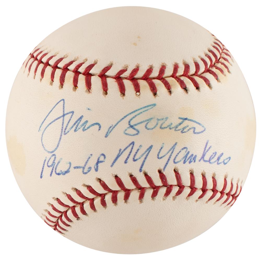Two official Rawlings Major League (Selig) baseballs, individually signed on the sweet spot in ballpoint by a former Yankees pitcher: “Jim Bouton, 1962-68 NY Yankees” and “Mike Torrez, ‘77 W.S. Champs, 10-18-77, Game 6 Clincher.” In overall fine condition, with small spots of toning to the Bouton ball, and an authenticity label to rear of Torrez ball.