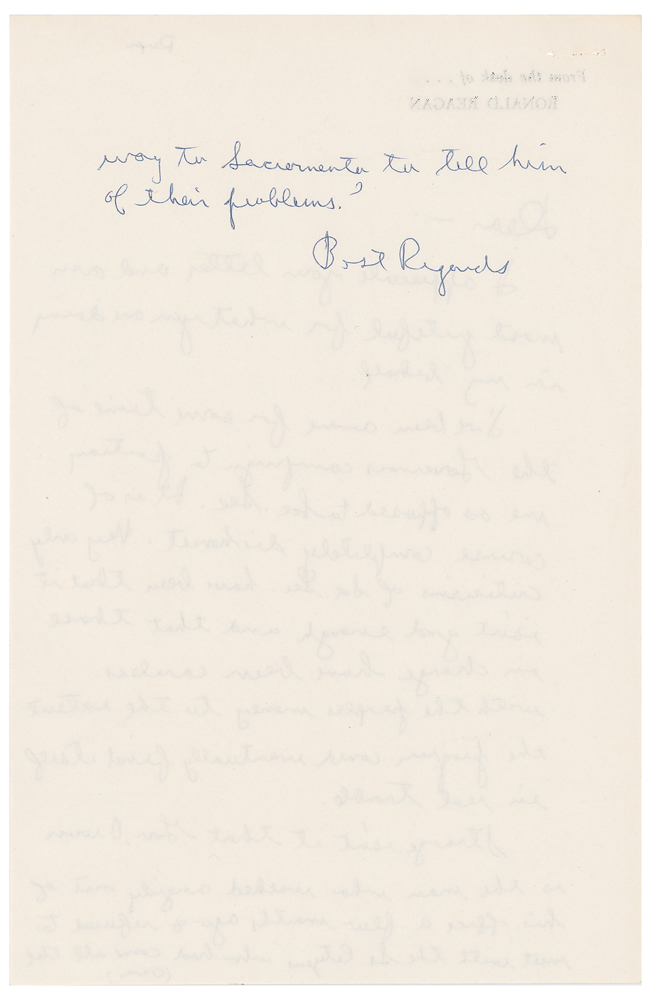 Handwritten letter from Ronald Reagan, unsigned, penned on both sides of a 5.5 x 8.5 sheet of 'From the desk of?Ronald Reagan' personal stationery, no date [mid-to-late 1970s]. In full: "I appreciate your letter and am most grateful for what you are doing in my behalf. I've been aware for some time of the Governor's campaign to portray me as opposed to Soc. Sec. It is of course completely dishonest. My only criticisms of Soc. Sec. have been that it isn't good enough and that those in charge have been careless with the peoples money to the extent the program could eventually find itself in real trouble. Strange isn't it that Gov. Brown is the man who walked angrily out of his office a few months ago & refused to meet with the Sr. Citizens who had come all the way to Sacramento to tell him of their problems? Best regards." In fine condition, with staple holes to the upper left corner.