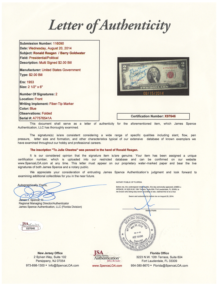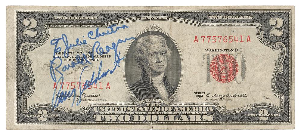 Series 1953 C 'red seal' two-dollar bill, signed and inscribed in blue felt tip, "To Julie Cheetna Ronald Reagan" and "Barry Goldwater." In very good condition, with creasing, soiling, and several vertical folds. Accompanied by a full letter of authenticity from JSA. A desirable format boasting dual autographs of the standard-bearers of the conservative movement.