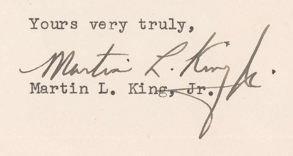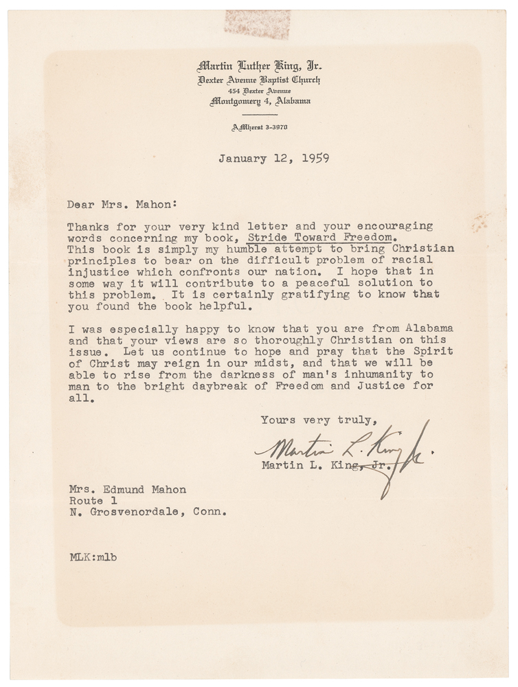 TLS signed “Martin L. King, Jr.,” one page, 7.25 x 9.75, Dexter Avenue Baptist Church letterhead, January 12, 1959. Letter to Mrs. Edmund Mahon, in full: "Thanks for your very kind letter and your encouraging words concerning my book, Stride Toward Freedom. This book is simply my humble attempt to bring Christian principles to bear on the difficult problem of racial injustice which confronts our nation. I hope that in some way it will contribute to a peaceful solution to this problem. It is certainly gratifying to know that you found the book helpful. I was especially happy to know that you are from Alabama and that your views are so thoroughly Christian on this issue. Let us continue to hope and pray that the Spirit of Christ may reign in our midst, and that we will be able to rise from the darkness of man's inhumanity to man to the bright daybreak of Freedom and Justice for all." In fine condition, with an old tape stain to the top edge, and a block of toning from prior display.