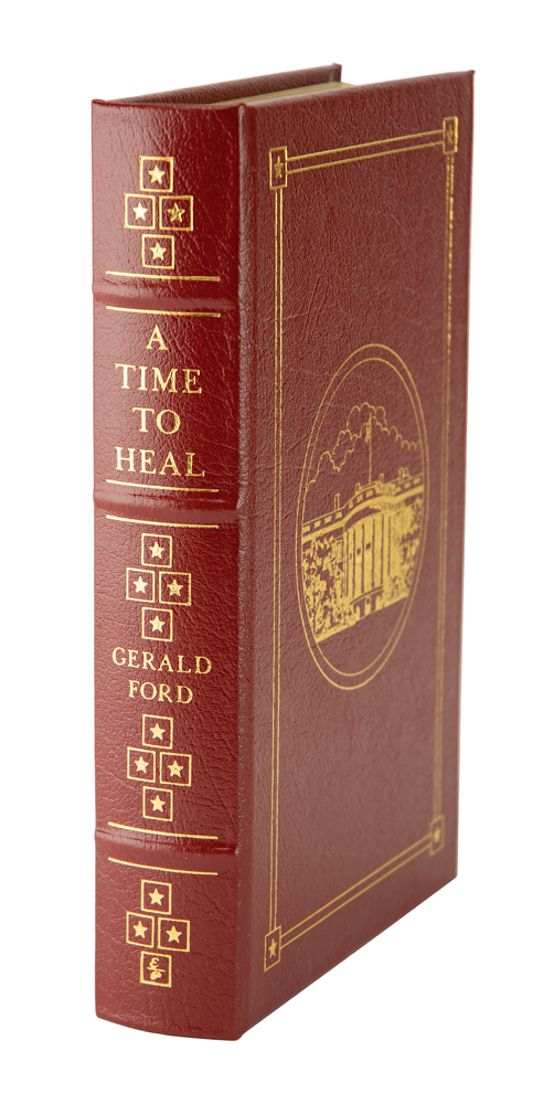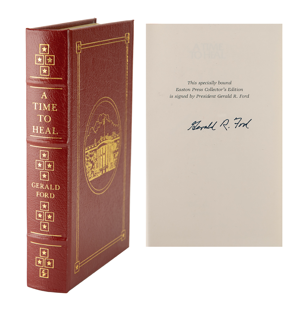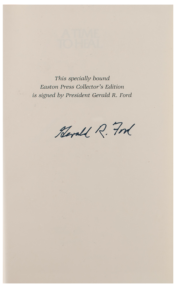 Signed book: A Time to Heal. Collector's edition. Norwalk, CT: Easton Press, 1987. Leatherbound hardcover, 6.5 x 9.5, 454 pages. Signed on the colophon in black felt tip, "Gerald R. Ford." In very fine condition. Accompanied by the original introductory booklet.