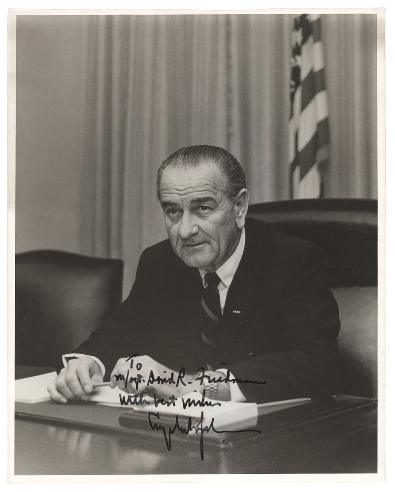 Vintage matte-finish 8 x 10 photo of President Johnson at his desk, signed and inscribed in fountain pen, "To M/Sgt. David R. Friedman, with best wishes, Lyndon B. Johnson.” Reverse is stamp-dated April 8, 1968. In fine condition.