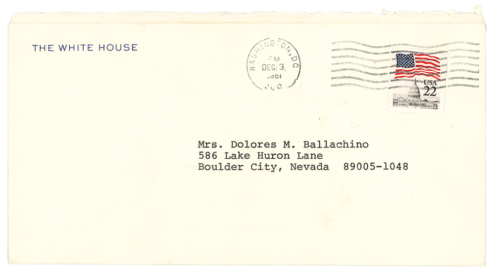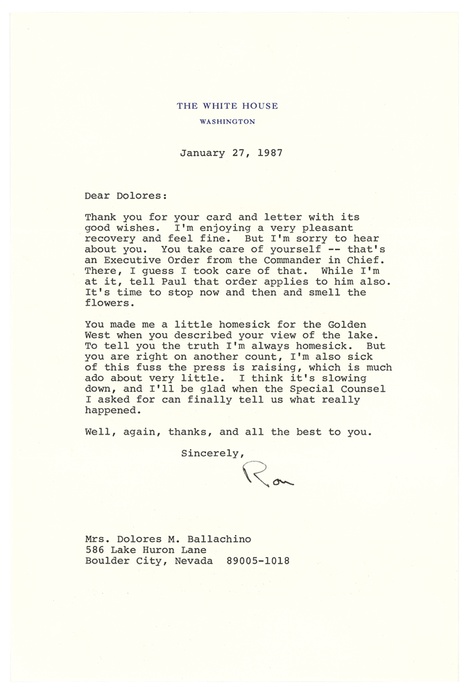 TLS as president signed “Ron,” one page, 7 x 10.5, White House letterhead, January 27, 1987. Letter to Dolores M. Ballachino, written on the day that he delivered his sixth State of the Union address. In part: "I'm enjoying a very pleasant recovery and feel fine. But I'm sorry to hear about you. You take care of yourself—that's an Executive Order from the Commander in Chief. There, I guess I took care of that. While I'm at it, tell Paul that order applies to him also. It's time to stop now and then smell the flowers. You made me a little homesick for the Golden West when you described your view of the lake. To tell you the truth I'm always homesick. But you are right on another count, I'm also sick of this fuss the press is raising, which is much ado about very little. I think it's slowing down, and I'll be glad when the Special Counsel I asked for can finally tell us what really happened." In fine condition. Accompanied by the original mailing envelope.