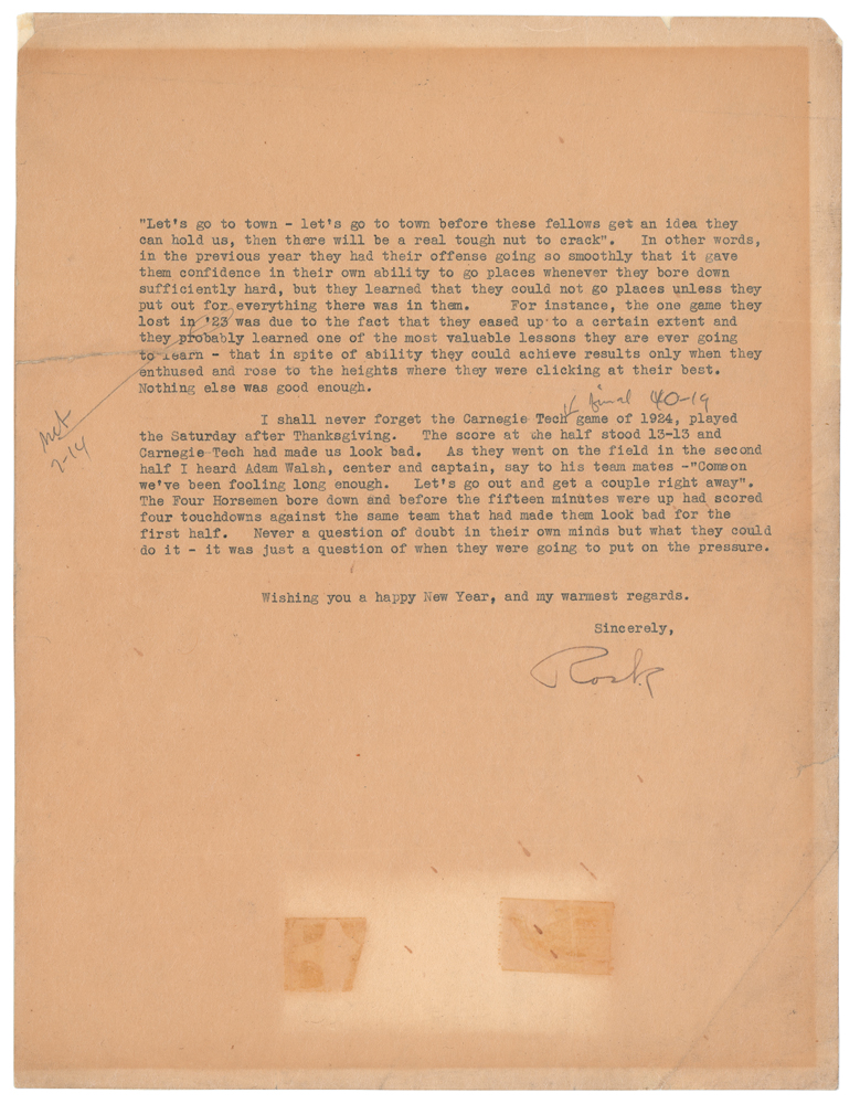 TLS signed “Rock,” two pages, 8.25 x 11, December 26, 1930, The Kahler letterhead. Letter to Joe Williams, the sports editor of the New York Telegram, in part: “I would say the outstanding feature of our team this year was the close knit bond of friendship and respect and inspiration that made it one. Everybody was pulling for the other fellow. However, for real athletes you have to hand it to the old Four Horsemen team. Somehow they seemed to go whenever they felt they had to, and for real poise, mental and physical, they had it. In their senior year I never saw a game that in their minds there was any doubt as to the result. Stuhldreher always felt they could go and you would hear him say to the men—'Let’s go to town—let’s go to town before these fellows get an idea they can hold us, then there will be a real tough nut to crack.’ In other words, in the previous year they had their offense going so smoothly that it gave them confidence in their own ability to go places whenever they bore down sufficiently hard, but they learned that they could not go places unless they put out for everything there was in them. For instance, the one game they lost in '23 was due to the fact that they eased up to a certain extent and they probably learned one of the most valuable lessons they are ever going to learn—that in spite of ability they could achieve results only when they enthused and rose to the heights where they were clicking at their best. Nothing else was good enough.