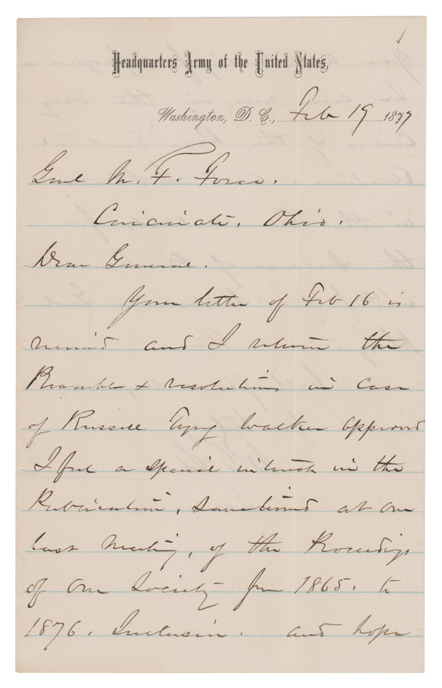 ALS signed “W. T. Sherman, General,” two pages on two adjoining sheets, 5 x 8, Headquarters Army of the United States letterhead, February 19, 1877. Letter to General Manning Ferguson Force, in part: "Your letter of Feb. 16 is received and I return the Preambles and resolutions in case of Russell?Walker?I find a special interest in the publication, sanctioned at our last meeting of the Proceedings of our Society-June 1865, to 1876 and hope you are making fair progress. We are now in the very crisis of the Presidential election, and I shall in the earnest wish for the success of our comrade and fellow statesman Genl. Hayes." In fine condition.