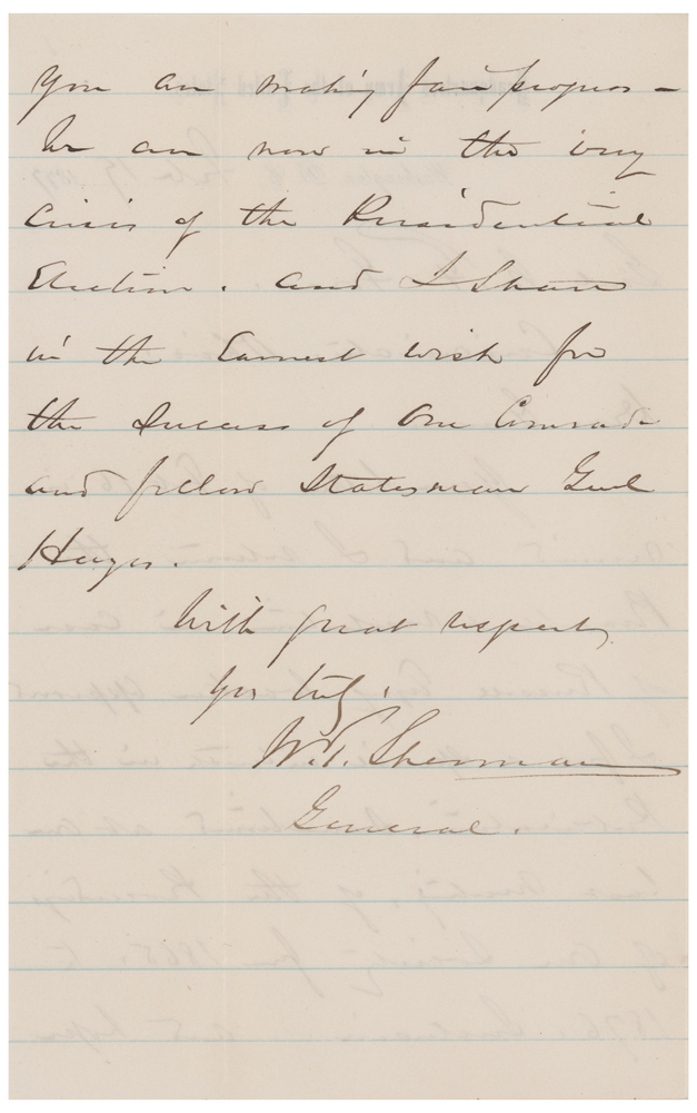 William T. Sherman: "We are now in the very crisis of the Presidential election," writes Sherman, who pledges his vote for his "comrade and fellow statesman Genl. Hayes"