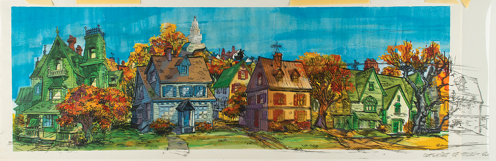 (Walt Disney Studios, 1961) Beautiful original hand-painted pan production background by noted Disney color stylist and background artist Walt Peregoy for the classic film 101 Dalmatians. The background shows a vibrant row of multicolored houses, several trees with colorful autumn leaves, and the high-reaching steeple of a church against a bright blue sky. Accomplished in gouache on 30.25 x 11 artist paper, with setup including its original matching 33 x 10.5 Xerox line overlay marked "Outskirt of Town" in the lower right corner; the overlay brings the scene to life with its added lined detail and dimension. Matted to an overall size of 35. x 15.5. In fine condition.