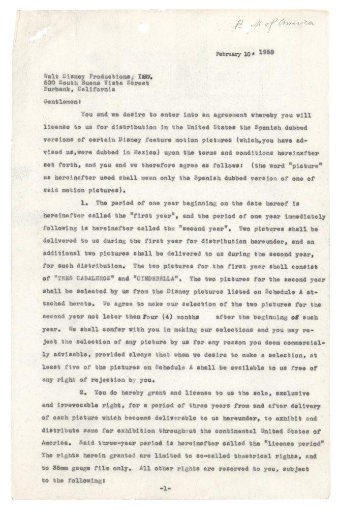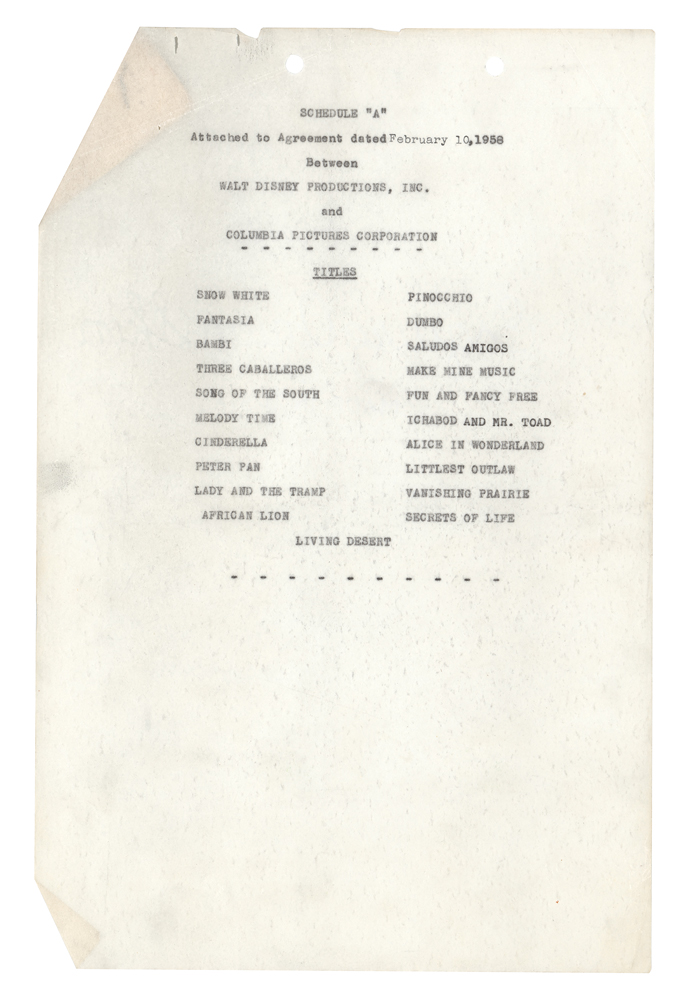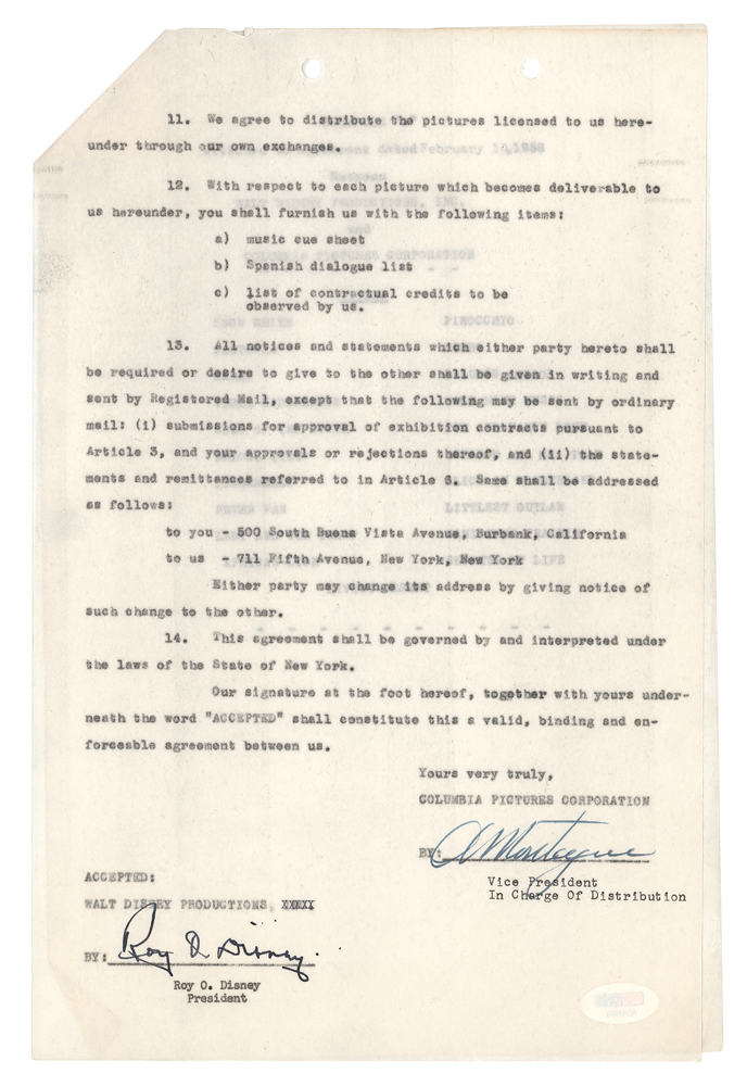 DS, ten pages, 8.5 x 13, February 10, 1958. Contract between Walt Disney Productions and Columbia Pictures, granting US distribution rights to Columbia Pictures for certain Spanish-dubbed versions of Disney films. The contract grants rights to The Three Caballeros and Cinderella for the first year of the deal, with the two pictures for the second year to be selected from a list on the attached "Schedule A"—among those listed are Snow White, Pinocchio, Peter Pan, Fantasia, Alice in Wonderland, and Dumbo. Signed at the conclusion in fountain pen by Roy O. Disney and countersigned by a Columbia Pictures executive. In fine condition, with the first page detached, some light creasing, and a PSA/DNA label affixed to the reverse of the signed page. Accompanied by a certificate of authenticity from PSA/DNA.