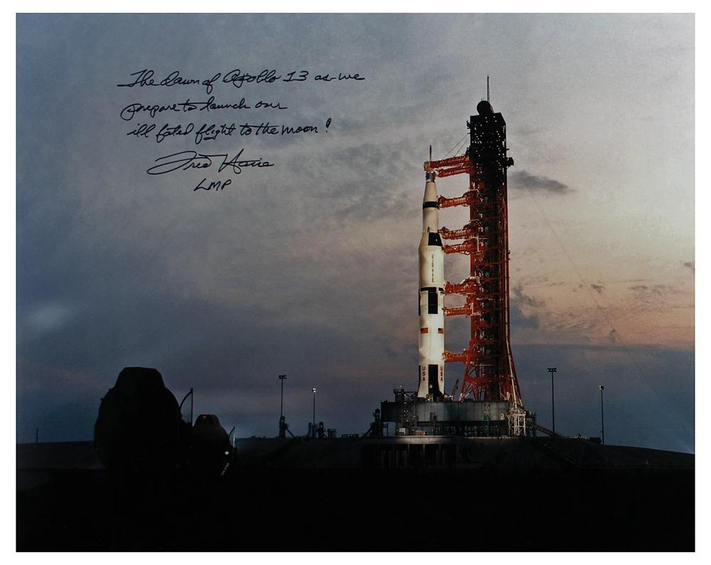 Attractive color satin-finish 20 x 16 photo of the Saturn V launch vehicle set to carry the Apollo 13 astronauts into space, signed in black felt tip, "The dawn of Apollo 13 as we prepare to launch our ill fated flight to the moon! Fred Haise, LMP." In fine condition.